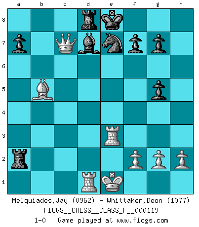 Last move : 1-0 2012 November 21 18:22:6 [Event "FICGS__CHESS__CLASS_F__000119"] [Site "FICGS"] [Date "2012.11.11"] [Round "1"] [White "Melquiades,Jay"] [Black "Whittaker,Deon"] [Result "1-0"] [WhiteElo "0962"] [BlackElo "1077"] 1.e4 e5 2.Nf3 Nc6 3.d4 exd4 4.Nxd4 Qh4 5.Nf3 Qxe4+ 6.Be3 Bb4+ 7.c3 Ba5 8.Nbd2 Qe6 9.Bc4 d5 10.Bd3 h6 11.b4 Bb6 12.Ng5 hxg5 13.Qa4 d4 14.cxd4 Bxd4 15.Rc1 Bxe3 16.Rd1 Bxd2+ 17.Kxd2 Bd7 18.Rhe1 Nxb4 19.Qxb4 Rh4 20.Qxb7 Rc8 21.Rxe6+ Ne7 22.Re3 Ra4 23.Ke1 Rxa2 24.Bb5 Rd8 25.Qxc7 1-0 Scotch : Fraser attack Player White won this chess game. Follow this game move after move (download)My style is somewhere between that of Tal and Petrosian. (Reshevsky) Schach ist die gewalttätigste aller Sportarten. (Garry Kasparov) La estratégia requiere pensar, la táctica requiere observación. (Max Euwe) La victoire dans une partie d'Echecs appartient la plupart du temps à celui qui voit un peu plus loin que l'adversaire. (Lasker) Go and wake up your luck. (Persian saying)