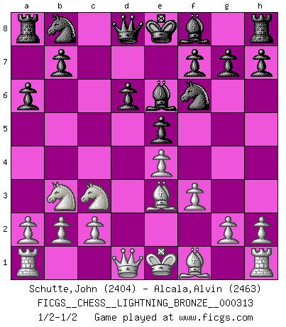 Last move : 1/2-1/2 2012 November 12 16:15:16 [Event "FICGS__CHESS__LIGHTNING_BRONZE__000313"] [Site "FICGS"] [Date "2012.11.12"] [Round "1"] [White "Schutte,John"] [Black "Alcala,Alvin"] [Result "1/2-1/2"] [WhiteElo "2404"] [BlackElo "2463"] 1.e4 c5 2.Nf3 d6 3.d4 cxd4 4.Nxd4 Nf6 5.Nc3 a6 6.f3 e5 7.Nb3 Be6 8.Be3 1/2-1/2 Sicilian : Najdorf This chess game ended in a draw. Follow this game move after move (download)What would Chess be without silly mistakes ? (Kurt Richter) Es hat in meinem Leben Zeiten gegeben, da ich sehr nahe daran war zu glauben, daß ich auch nicht eine einzige Schachpartie verlieren könnte. (José Raúl Capablanca) Existen dos clases de sacrificios: los correctos y los míos. (Mikhail Tal) A ce moment-là, je menaçais de comprendre la position ! (Clément L'Heureux) All men can see these tactics whereby I conquer, but what none can see is the strategy out of which victory is evolved. (Sun Tzu)