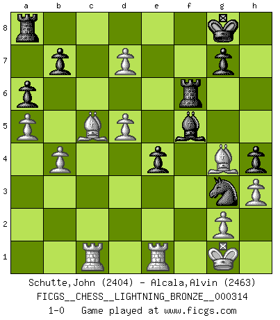 Last move : 1-0 2012 November 12 17:8:16 [Event "FICGS__CHESS__LIGHTNING_BRONZE__000314"] [Site "FICGS"] [Date "2012.11.12"] [Round "1"] [White "Schutte,John"] [Black "Alcala,Alvin"] [Result "1-0"] [WhiteElo "2404"] [BlackElo "2463"] 1.e4 c5 2.Nf3 d6 3.d4 cxd4 4.Nxd4 Nf6 5.Nc3 a6 6.f3 e5 7.Nb3 Be6 8.Be3 h5 9.Be2 Nbd7 10.Nd5 Nxd5 11.exd5 Bf5 12.O-O h4 13.Qd2 Be7 14.h3 Nf6 15.Na5 Rb8 16.Nc4 O-O 17.a4 Nh5 18.Rfe1 Ng3 19.a5 Qe8 20.Nb6 Bh7 21.c4 Qd8 22.b4 f5 23.Bd3 e4 24.fxe4 fxe4 25.Bc2 Bf6 26.Rab1 Rf7 27.c5 Be5 28.Nc4 Qf6 29.Nxe5 Qxe5 30.cxd6 Rbf8 31.Bd4 Qh5 32.Bc5 Rd8 33.Bd1 Qe5 34.Rc1 Ra8 35.Bg4 Bf5 36.Qg5 Qf6 37.Qxf6 Rxf6 38.d7 1-0 Sicilian : Najdorf Kingside Castling by player White (move 12) Kingside Castling by player Black (move 16) Player White won this chess game. Follow this game move after move (download)All Chess players should have a hobby. (Savielly Tartakower) Wie bekannt hörte Morphy 1859 auf, Schach zu spielen. Seine Enttäuschung galt nicht so sehr dem Schach, wie den Schachspielern. (Robert James Fischer) La única cosa que los jugadores de Ajedrez tienen en común, es el Ajedrez. (Lodewijk Prins) Les erreurs sont comme les malheurs, elles n'arrivent jamais seules. (Siegbert Tarrasch) The bottom line is always the bottom line. (Johann Piek)