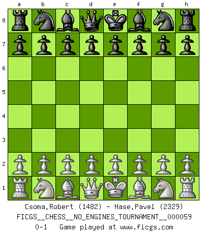 Last move : 0-1 2012 December 30 23:19:54 [Event "FICGS__CHESS__NO_ENGINES_TOURNAMENT__000059"] [Site "FICGS"] [Date "2012.11.13"] [Round "1"] [White "Csoma,Robert"] [Black "Hase,Pavel"] [Result "0-1"] [WhiteElo "1482"] [BlackElo "2329"] 0-1 This chess game has been lost on time (started : 2012.11.13 19:59:15) Player Black won this chess game. Follow this game move after move (download)Bobby is the most misunderstood, misquoted celebrity walking the face of this earth. (Yasser Seirawan) Ohne Fehler kann es keine Brillanz geben. (Emanuel Lasker) Bobby es el jugador de Ajedrez mas fino que este país jamás haya producido. Su memoria para las movidas, su brillantez en soñar combinaciones y su feróz determinación por la victoria son algo extraño. (John Collins) Avant la finale, les dieux ont créé le milieu de partie. (Tarrasch) Knowledge rests not upon truth alone, but upon error also. (Carl G. Jung)