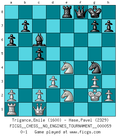 Last move : 0-1 2013 January 12 10:15:33 [Event "FICGS__CHESS__NO_ENGINES_TOURNAMENT__000059"] [Site "FICGS"] [Date "2012.11.13"] [Round "1"] [White "Trigance,Emile"] [Black "Hase,Pavel"] [Result "0-1"] [WhiteElo "1600"] [BlackElo "2329"] 1.b4 e5 2.Bb2 Bxb4 3.f4 d6 4.fxe5 dxe5 5.Bxe5 Bd6 6.Bxd6 Qxd6 7.e3 c5 8.Nc3 Nf6 9.Be2 Nc6 10.Nf3 O-O 11.O-O a6 12.Qe1 Bf5 13.d3 Rae8 14.Qc1 Ng4 15.e4 Nd4 16.g3 Bd7 17.Kg2 Nxe2 18.Nxe2 f5 19.Ng5 fxe4 20.Nxe4 Bc6 21.Rxf8+ Qxf8 0-1 Polish (Sokolsky) opening Kingside Castling by player Black (move 10) Kingside Castling by player White (move 11) Player Black won this chess game. Follow this game move after move (download)Only the player with the initiative has the right to attack. (Wilhelm Steinitz) Es gibt keine einzige Frau, der ich nicht einen Springer vorgeben könnte und trotzdem gewänne. (Robert James Fischer) La táctica fluye a partir de una posición superior. (Bobby Fischer) Les Echecs ont trois composantes : le temps, l'espace et le matériel en dernier. (Mikhail Tal) Have no fear of perfection - you'll never reach it. (Salvador Dali)