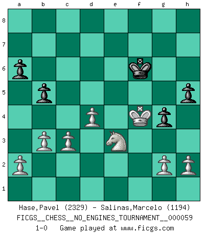 Last move : 1-0 2013 July 9 14:27:18 [Event "FICGS__CHESS__NO_ENGINES_TOURNAMENT__000059"] [Site "FICGS"] [Date "2012.11.13"] [Round "1"] [White "Hase,Pavel"] [Black "Salinas,Marcelo"] [Result "1-0"] [WhiteElo "2329"] [BlackElo "1194"] 1.e4 e6 2.d4 d5 3.e5 Bb4+ 4.c3 Be7 5.Bd3 Bg5 6.Nf3 Bxc1 7.Qxc1 f6 8.exf6 Nxf6 9.O-O Qd6 10.Qg5 O-O 11.Nbd2 Nbd7 12.Rae1 Ne4 13.Nxe4 Qf4 14.Qxf4 Rxf4 15.Neg5 Nf6 16.Nxe6 Bxe6 17.Rxe6 Ne4 18.Ne5 Raf8 19.Bxe4 dxe4 20.f3 exf3 21.Rxf3 Rxf3 22.Nxf3 Kf7 23.Ng5+ Kg8 24.Re7 h6 25.Ne6 Rf7 26.Rxf7 Kxf7 27.Nxc7 Ke7 28.Nb5 a6 29.Na3 g5 30.Kf2 g4 31.Ke3 Kf6 32.Ke4 Ke6 33.Nc4 b5 34.Ne3 h5 35.Kf4 Kf6 36.b3 1-0 This chess game has been lost on time (started : 2012.11.13 19:59:15) French : Advance variation Kingside Castling by player White (move 9) Kingside Castling by player Black (move 10) Player White won this chess game. Follow this game move after move (download)At this time Fischer is simply a level above all the best Chessplayers in the world. (John Jacobs) Ich bin stolz ein Bulgare zu sein. (Veselin Topalov) Una de estas pequeñas movidas modestas pudieran ser mas molestas a tu oponente que la amenaza mas grande. (Siegbert Tarrasch) Le système Elo représente seulement une moyenne. Il est simplement un indicateur de votre stabilité. (Anatoli Karpov) The good fighters of old first put themselves beyond the possibility of defeat, and then waited for an opportunity of defeating the enemy. (Sun Tzu)