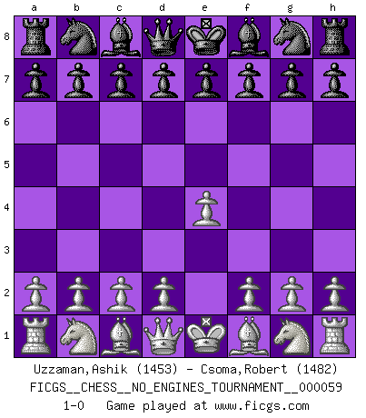Last move : 1-0 2012 December 31 11:19:0 [Event "FICGS__CHESS__NO_ENGINES_TOURNAMENT__000059"] [Site "FICGS"] [Date "2012.11.13"] [Round "1"] [White "Uzzaman,Ashik"] [Black "Csoma,Robert"] [Result "1-0"] [WhiteElo "1453"] [BlackElo "1482"] 1.e4 1-0 This chess game has been lost on time (started : 2012.11.13 19:59:15) King's pawn Opening Player White won this chess game. Follow this game move after move (download)Every Pawn is a potential Queen. (James Mason) Die westlichen Werte sind eine Sprache, welche die Putin-Administration nicht versteht. (Garry Kasparov) El Ajedrez se juega con la mente... ¡no con las manos!. (Renaud y Kahn) Vouloir jouer aux échecs contre soi-même est aussi paradoxal que vouloir marcher sur son ombre. (Stefan Zweig) The only difference between a tax man and a taxidermist is that the taxidermist leaves the skin. (Mark Twain)