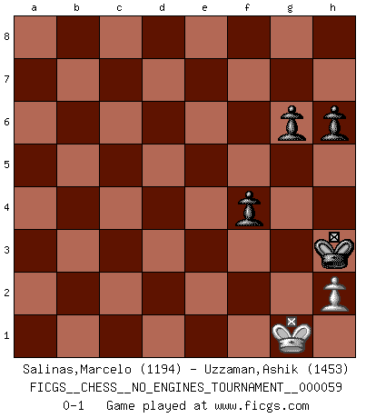Last move : 0-1 2013 May 2 9:46:24 [Event "FICGS__CHESS__NO_ENGINES_TOURNAMENT__000059"] [Site "FICGS"] [Date "2012.11.13"] [Round "1"] [White "Salinas,Marcelo"] [Black "Uzzaman,Ashik"] [Result "0-1"] [WhiteElo "1194"] [BlackElo "1453"] 1.d3 e5 2.Nf3 Nc6 3.Bg5 Be7 4.Qd2 Bxg5 5.Qxg5 Qxg5 6.Nxg5 h6 7.Ne4 d5 8.Nc5 b6 9.Nb3 Nf6 10.N1d2 a5 11.a4 Nb4 12.Rc1 Bd7 13.d4 e4 14.c3 Na6 15.e3 Bxa4 16.Bxa6 Rxa6 17.Ra1 Bb5 18.f3 O-O 19.fxe4 dxe4 20.c4 Bd7 21.d5 c6 22.c5 cxd5 23.cxb6 Rxb6 24.Rxa5 Rfb8 25.Ra3 Ng4 26.Nc5 Bc6 27.b3 Nxe3 28.Ra6 Nxg2+ 29.Kf2 e3+ 30.Kxg2 exd2 31.Kf2 Rxa6 32.Nxa6 Rxb3 33.Rd1 Rb2 34.Ke3 Ba4 35.Rxd2 Rxd2 36.Kxd2 f5 37.Ke3 Bc2 38.Nb4 Be4 39.Kd4 Kf7 40.Ke5 g6 41.Nxd5 Bxd5 42.Kxd5 Kf6 43.Kd4 Kg5 44.Ke3 Kg4 45.Kf2 Kh3 46.Kg1 f4 0-1 Mieses Opening Kingside Castling by player Black (move 18) 10 pieces endgame at move 35 : White KNP , Black KRBPPPP WHITE : King + 1 Knight 1 Pawn BLACK : King + 1 Rook 1 Bishop 4 Pawns 9 pieces endgame at move 36 : White KNP , Black KBPPPP WHITE : King + 1 Knight 1 Pawn BLACK : King + 1 Bishop 4 Pawns 8 pieces endgame at move 41 : White KNP , Black KBPPP WHITE : King + 1 Knight 1 Pawn BLACK : King + 1 Bishop 3 Pawns 7 pieces endgame at move 41 : White KP , Black KBPPP WHITE : King + 1 Pawn BLACK : King + 1 Bishop 3 Pawns 6 pieces endgame at move 42 : White KP , Black KPPP WHITE : King + 1 Pawn BLACK : King + 3 Pawns Player Black won this chess game. Follow this game move after move (download)It is difficult to play against Einstein's theory --on his first loss to Fischer. (Mikhail Tal) Der Schachmeister von Heute braucht Courage, einen Killerinstinkt, Ausdauer und Arroganz. (Larry Evans) De todos mis libros Rusos, la defensa contiene y difunde el 'calor' mas grande que pudiese verse extraño al observar lo supremamente abstracto que el Ajedrez supuestamente es. (Vladimir Nabokov) Les sacrifices démontrent seulement que quelqu'un a gaffé. (Savielly Tartacover) The greatest con, that he ever pulled... was making you believe... that he is you. (Revolver, movie)