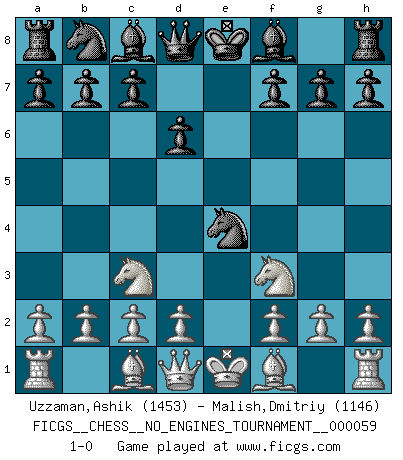 Last move : 1-0 2013 January 1 23:25:30 [Event "FICGS__CHESS__NO_ENGINES_TOURNAMENT__000059"] [Site "FICGS"] [Date "2012.11.13"] [Round "1"] [White "Uzzaman,Ashik"] [Black "Malish,Dmitriy"] [Result "1-0"] [WhiteElo "1453"] [BlackElo "1146"] 1.e4 e5 2.Nf3 Nf6 3.Nxe5 d6 4.Nf3 Nxe4 5.Nc3 1-0 This chess game has been lost on time (started : 2012.11.13 19:59:15) Petrov : Nimzovich attack Player White won this chess game. Follow this game move after move (download)Of Chess it has been said that life is not long enough for it, but that is the fault of life, not Chess. (William Ewart Napier) Offener Brief an US-Präsident Bush anlässlich der Verhaftung Bobby Fishers: Verhaften Sie mich. Stecken Sie mich in dieselbe Zelle wie Bobby Fisher und geben Sie uns ein Schachspiel mit. (Boris Vassilievich Spassky) Mis oponentes también hacen buenas movidas. A veces yo no tomo esas cosas en consideración. (Bobby Fischer) Le succès, c'est être capable d'aller d'échec en échec sans perdre son enthousiasme. (Winston Churchill) We're missing something. (Gregory House, House M.D.)