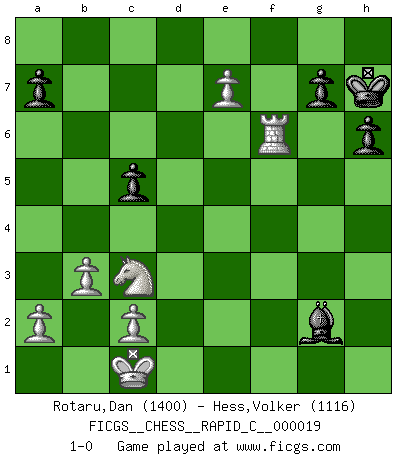 Last move : 1-0 2007 February 5 17:44:17 [Event "FICGS__CHESS__RAPID_C__000019"] [Site "FICGS"] [Date "2007.01.18"] [Round "1"] [White "Rotaru,Dan"] [Black "Hess,Volker"] [Result "1-0"] [WhiteElo "1400"] [BlackElo "1116"] 1.d4 d6 2.e4 Nf6 3.Nc3 e5 4.Nf3 Be7 5.dxe5 dxe5 6.Qxd8+ Bxd8 7.Nxe5 O-O 8.Bc4 Nc6 9.Nxc6 bxc6 10.Bf4 Be6 11.Be2 Rc8 12.O-O-O Be7 13.Ba6 Bd6 14.Bxd6 cxd6 15.Bxc8 Rxc8 16.Rxd6 Ng4 17.Rhd1 h6 18.Rd8+ Rxd8 19.Rxd8+ Kh7 20.f4 Nxh2 21.f5 Bc4 22.b3 Bf1 23.e5 Ng4 24.e6 fxe6 25.fxe6 Bxg2 26.e7 Nf6 27.Rf8 c5 28.Rxf6 1-0 Queen's Pawn Kingside Castling by player Black (move 7) Queenside Castling by player White (move 12) Player White won this chess game. Follow this game move after move (download)Dazzling combinations are for the many, shifting wood is for the few. (Georg Kieninger) Viele Opfer benötigen überhaupt keine konkrete Berechnung. Es genügt sich die entstehende Position kurz vorzustellen, um uns davon zu überzeugen, dass das Opfer korrekt ist. (Mikhail Nekhemyevich Tal) De eso se trata el Ajedrez. Un día le das una lección a tu oponente y al día siguiente el te da una a tí. (Bobby Fischer) Demandez au pauvre Cg1 ce qu'il en pense. Eduard Gufeld à propos de la variante Saemisch de l'Est-Indienne. Every now and then a man's mind is stretched by a new idea and never shrinks back to its former dimensions. (Oliver Wendell Holmes, Sr.)