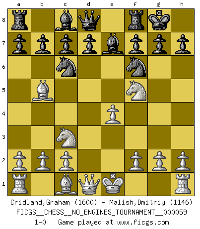 Last move : 1-0 2013 January 2 23:31:11 [Event "FICGS__CHESS__NO_ENGINES_TOURNAMENT__000059"] [Site "FICGS"] [Date "2012.11.13"] [Round "1"] [White "Cridland,Graham"] [Black "Malish,Dmitriy"] [Result "1-0"] [WhiteElo "1600"] [BlackElo "1146"] 1.e4 e5 2.Nf3 Nc6 3.Bb5 Nf6 4.d4 exd4 5.Nxd4 Be7 6.Nf5 O-O 7.Nc3 1-0 This chess game has been lost on time (started : 2012.11.13 19:59:15) Ruy Lopez : Berlin defense Kingside Castling by player Black (move 6) Player White won this chess game. Follow this game move after move (download)You cannot play at Chess if you are kind-hearted. (French Proverb) Ich liebe den Moment, wenn ich das Ego meines Gegenüber breche. (Robert James Fischer) Si no le temes a Spassky, entonces elimino el elemento del dinero. (Jim Slater) Que feriez-vous si vous étiez en train de jouer aux échecs et que la fin du monde arrive ? Je continuerais à jouer. (Saint Borromée) Children in the dark cause accidents, accidents in the dark cause children. (Unknown)