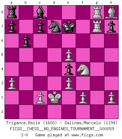 Last move : 1-0 2013 January 4 9:10:40 [Event "FICGS__CHESS__NO_ENGINES_TOURNAMENT__000059"] [Site "FICGS"] [Date "2012.11.13"] [Round "1"] [White "Trigance,Emile"] [Black "Salinas,Marcelo"] [Result "1-0"] [WhiteElo "1600"] [BlackElo "1194"] 1.b4 e6 2.Bb2 Bxb4 3.Bxg7 Qg5 4.Bxh8 Nf6 5.Nf3 Qf5 6.a3 Bc5 7.e3 d5 8.d4 Bb6 9.Bd3 Ne4 10.Bxe4 dxe4 11.Nfd2 f6 12.Nc3 Ba5 13.Ne2 Qg6 14.Nf4 Qf7 15.Qh5 Bxd2+ 16.Kxd2 Nd7 17.g4 Kf8 18.g5 Kg8 19.Qxf7+ Kxf7 20.gxf6 b6 21.Rhg1 Nxf6 22.Rg7+ Kf8 23.Rag1 e5 24.dxe5 Nd7 25.Rg8+ Ke7 26.R1g7+ 1-0 Polish (Sokolsky) opening Player White won this chess game. Follow this game move after move (download)Avoid the crowd. Do your own thinking independently. Be the Chess player, not the Chess piece. (Ralph Charell) Wie ich sie so einen nach dem anderen nieder mähte wurde meine Überlegenheit offensichtlich. (José Raúl Capablanca) El juego de Damas es para vagabundos. (Paul Morphy) Les écrivains ont utilisé les échecs pour analyser les côtés extrêmes de la nature humaine. Dans ce cadre, les échecs offrent un champ d'expérimentation idéal. Mais on pourrait faire la même chose avec la peinture. Et là, en vous référant à Van Gogh, vous ne tirerez pas de conclusion définitive sur les peintres. (Gary Kasparov) Winning isn't everything... but losing is nothing. (Mednis)