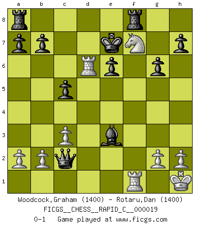 Last move : 0-1 2007 February 28 16:48:2 [Event "FICGS__CHESS__RAPID_C__000019"] [Site "FICGS"] [Date "2007.01.18"] [Round "1"] [White "Woodcock,Graham"] [Black "Rotaru,Dan"] [Result "0-1"] [WhiteElo "1400"] [BlackElo "1400"] 1.e4 c5 2.Bc4 Nc6 3.Nf3 d6 4.Ng5 e6 5.Qh5 g6 6.Qf3 Qxg5 7.O-O Nd4 8.Qd3 Nf6 9.c3 Nc6 10.Qf3 Bg7 11.d4 Qh4 12.d5 Ne5 13.Bb5+ Bd7 14.Bxd7+ Kxd7 15.Nd2 Nxf3+ 16.Nxf3 Qxe4 17.dxe6+ fxe6 18.Ng5 Qc2 19.Be3 Ng4 20.Rad1 Nxe3 21.fxe3 Bh6 22.Nf7 Bxe3+ 23.Kh1 Rhf8 24.Rxd6+ Ke7 0-1 Sicilian defense Kingside Castling by player White (move 7) Player Black won this chess game. Follow this game move after move (download)I played Chess with him and would have beaten him sometimes only he always took back his last move, and ran the game out differently. (Mark Twain) Gewöhnliche Menschen denken nur daran, wie sie ihre Zeit verbringen. Ein intelligenter Mensch versucht, sie auszunutzen. (Arthur Schopenhauer) No es suficiente ser un buen jugador, se debe también de jugar bién. (Siegbert Tarrasch) Celui qui prend des risques peut perdre, celui qui n'en prend pas perd toujours. (Xavier Tartacover) If you are going through hell, keep going. (Winston Churchill)