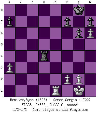 Last move : 1/2-1/2 2006 September 21 14:16:8 [Event "FICGS__CHESS__CLASS_C__000004"] [Site "FICGS"] [Date "2006.05.16"] [Round "1"] [White "Benitez,Ryan"] [Black "Gomes,Sergio"] [Result "1/2-1/2"] [WhiteElo "1602"] [BlackElo "1700"] 1.e4 c5 2.Nf3 d6 3.c3 Nf6 4.Be2 g6 5.d4 cxd4 6.O-O Bg7 7.Bf4 Nxe4 8.cxd4 O-O 9.Bd3 Nf6 10.Nc3 Nc6 11.Be2 Qa5 12.d5 Nb4 13.Bc4 Bf5 14.a3 Nh5 15.Bg5 Bxc3 16.bxc3 Nc2 17.Nd4 Nxd4 18.Qxd4 e5 19.dxe6 Bxe6 20.Bxe6 Qxg5 21.Bd5 Nf4 22.Bf3 Ne6 23.Qxd6 Rac8 24.Bxb7 Rxc3 25.Qb4 Nf4 26.Rae1 Qf6 27.Qa5 Nd3 28.Rd1 Qd4 29.Ba6 Rb8 30.Bxd3 Rxd3 31.Rxd3 Qxd3 32.h4 Qd7 33.Re1 Qd4 34.Qe5 Rd8 35.h5 Rd5 36.Qxd4 Rxd4 37.h6 1/2-1/2 Sicilian Kingside Castling by player White (move 6) Kingside Castling by player Black (move 8) This chess game ended in a draw. Follow this game move after move (download)What would Chess be without silly mistakes ? (Kurt Richter) Die jungen Leute sollen verstehen, dass sie noch etwas von mir lernen können und müssen. (Viktor Kortschnoi) En manos de Fischer's, una diminuta ventaja teórica es tan buena como tener una Reina de ventaja. (Isaac Kashdan) Vous n'êtes pas toujours obligé de jouer le meilleur coup. Un coup doit être actif, entreprenant, correct et beau ! (David Bronstein) Now the reason the enlightened prince and the wise general conquer the enemy whenever they move and their achievements surpass those of ordinary men is foreknowledge. (Sun Tzu)