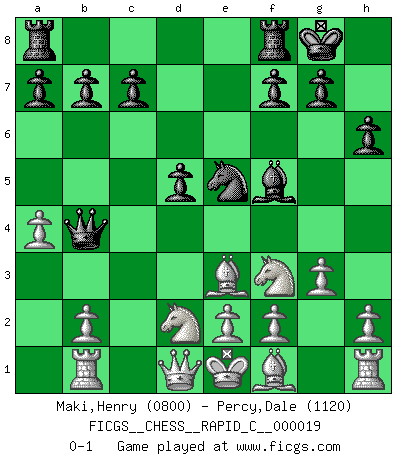 Last move : 0-1 2007 March 19 7:26:17 [Event "FICGS__CHESS__RAPID_C__000019"] [Site "FICGS"] [Date "2007.01.18"] [Round "1"] [White "Maki,Henry"] [Black "Percy,Dale"] [Result "0-1"] [WhiteElo "0800"] [BlackElo "1120"] 1.Nf3 e6 2.g3 Nf6 3.d4 Ne4 4.Be3 Bb4+ 5.c3 Nc6 6.Nbd2 O-O 7.Nxe4 Qe7 8.Nfg5 d5 9.cxb4 Qxb4+ 10.Nd2 e5 11.Rb1 h6 12.a3 Qb5 13.a4 Qb4 14.dxe5 Nxe5 15.Ngf3 Bf5 0-1 This chess game has been lost on time (started : 2007.01.18 9:42:1) Reti Opening Kingside Castling by player Black (move 6) Player Black won this chess game. Follow this game move after move (download)When the Chess game is over, the Pawn and the King go back to the same box. (Irish saying) Ich bin Weltmeister und muß mit niemandem irgend etwas diskutieren. (Viswanathan Anand) Por la belleza de sus partidas, la claridad de su juego y lo brillante de sus ideas, Fischer se creó el mismo como un artista de la misma estatura como Brahms, Rembrandt y Shakespeare. (David Levy) Les Echecs ne sont pas pour les âmes timides. Ils requièrent un homme entier, qui ne s'arrête pas aveuglément à ce qui a été déjà établi, mais qui tente individuellement de sonder les profondeurs du jeu. (W. Steinitz) How many people work in NATO Headquarters ? - About half of them. (Dirk Stikker, NATO general secretary)
