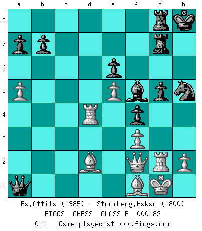 Last move : 0-1 2013 February 1 6:46:37 [Event "FICGS__CHESS__CLASS_B__000182"] [Site "FICGS"] [Date "2012.11.14"] [Round "1"] [White "Ba,Attila"] [Black "Stromberg,Hakan"] [Result "0-1"] [WhiteElo "1985"] [BlackElo "1800"] 1.d4 d5 2.c4 c6 3.Nf3 Nf6 4.Qb3 dxc4 5.Qxc4 Bf5 6.g3 e6 7.Bg2 Be7 8.O-O Nbd7 9.Nc3 O-O 10.Re1 Ne4 11.Qb3 Qb6 12.Nh4 Bxh4 13.gxh4 Ndf6 14.f3 Nxc3 15.bxc3 Qc7 16.e4 Bg6 17.a4 Nh5 18.a5 h6 19.Be3 Rab8 20.Qa2 Rfd8 21.Qf2 Rd7 22.Bf1 Rbd8 23.Ra2 Kh7 24.Ra4 f5 25.e5 f4 26.Bc1 Bf5 27.Kh1 Rg8 28.Be2 g5 29.Rg1 Rdg7 30.hxg5 hxg5 31.Rg2 Kh8 32.Kg1 c5 33.Bf1 cxd4 34.Rxd4 Qxc3 35.Bd2 Qa1 0-1 QGD Slav : 3.Nf3 Kingside Castling by player White (move 8) Kingside Castling by player Black (move 9) Player Black won this chess game. Follow this game move after move (download)I thought the most common mistake [in chess] was the first one: Learning the game :P (Garvin Gray, FICGS forum) Ich habe die Schachforschung dermaßen betrieben, dass sie auf eine wissenschaftliche Basis gestellt wurde. (Mikhail Moiseyevich Botvinik) El hombre es un frívolo, una creatura engañosa y como un jugador de Ajedrez, se preocupa mas por el proceso de obtener su meta que de la meta por sí misma. (Dostoyevsky) J'ai vu le vaincu d'Echecs jouer des années durant dans l'espoir de la fête de la victoire. Car tu es plus riche de ce qu'elle existe si même elle n'est point pour toi. Ainsi de la perle du fond des mers. (Antoine de Saint-Exupéry) There are 10 types of people in this world: those who understand binary and those who don't. (Anonymous)