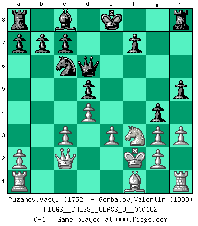 Last move : 0-1 2013 February 26 16:19:50 [Event "FICGS__CHESS__CLASS_B__000182"] [Site "FICGS"] [Date "2012.11.14"] [Round "1"] [White "Puzanov,Vasyl"] [Black "Gorbatov,Valentin"] [Result "0-1"] [WhiteElo "1752"] [BlackElo "1988"] 1.d4 d5 2.c4 e6 3.cxd5 exd5 4.Nc3 Nc6 5.Nf3 Bb4 6.Bf4 Nf6 7.e3 Ne4 8.Qc2 g5 9.Bg3 h5 10.h3 Bxc3+ 11.bxc3 Nxg3 12.fxg3 Qd6 13.Kf2 g4 0-1 This chess game has been lost on time (started : 2012.11.14 3:58:29) Queen's gambit declined Player Black won this chess game. Follow this game move after move (download)One doesn't have to play well, it's enough to play better than your opponent. (Siegbert Tarrasch) Nie in meinem Leben habe ich die französische Verteidigung gespielt, welche die Stumpfsinnigste von allen ist. (Wilhelm Steinitz) Evita las multitudes. Haz independientemente tu propio razonamiento. Trata de ser el jugador de Ajedrez, no la pieza de Ajedrez. (Ralph Charell) Celui qui prend des risques peut perdre, celui qui n'en prend pas perd toujours. (Xavier Tartacover) There are three kinds of lies: lies, damned lies and statistics. (Mark Twain)