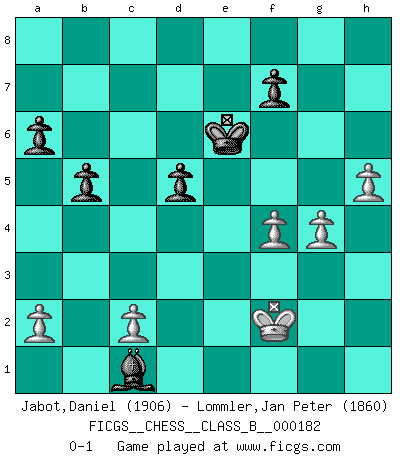Last move : 0-1 2013 April 14 22:48:9 [Event "FICGS__CHESS__CLASS_B__000182"] [Site "FICGS"] [Date "2012.11.14"] [Round "1"] [White "Jabot,Daniel"] [Black "Lommler,Jan Peter"] [Result "0-1"] [WhiteElo "1906"] [BlackElo "1860"] 1.e4 c5 2.Nf3 d6 3.d4 cxd4 4.Nxd4 Nf6 5.Nc3 a6 6.Bg5 e6 7.f4 Be7 8.Qf3 Qc7 9.O-O-O Nbd7 10.Bd3 b5 11.Rhe1 Bb7 12.Nd5 exd5 13.Nf5 Kf8 14.Qg3 dxe4 15.Bxe4 Bxe4 16.Rxe4 Qc5 17.Bh6 Nxe4 18.Qxg7+ Ke8 19.Qxh8+ Nf8 20.Bxf8 Bxf8 21.Qxh7 Ra7 22.Rd4 Re7 23.b4 Qc3 24.Rxe4 Rxe4 25.Ng7+ Kd8 26.Qxe4 Bxg7 27.Qa8+ Qc8 28.Qxc8+ Kxc8 29.Kd2 d5 30.g4 Bf6 31.Kd3 Kd7 32.Ke3 Bc3 33.h4 Bxb4 34.h5 Ke6 35.Ke2 Ba3 36.Kf2 Bc1 0-1 Sicilian : Najdorf, 7...Be7 Queenside Castling by player White (move 9) Player Black won this chess game. Follow this game move after move (download)The Pin is mightier than the sword. (Fred Reinfeld) Schach ist das Spiel, das die Verrückten gesund hält. (Albert Einstein) Mi estilo es algo parecido entre un poco de Tal y Petrosian. (Reshevsky) Toute estimation doit être constamment réévaluée. (Jacob Estrin) A married woman is like a fish riding a bicycle. (Rodolfo d'Ettorre)