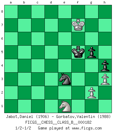 Last move : 1/2-1/2 2013 June 19 14:30:59 [Event "FICGS__CHESS__CLASS_B__000182"] [Site "FICGS"] [Date "2012.11.14"] [Round "1"] [White "Jabot,Daniel"] [Black "Gorbatov,Valentin"] [Result "1/2-1/2"] [WhiteElo "1906"] [BlackElo "1988"] 1.e4 c5 2.Nf3 Nc6 3.d4 cxd4 4.Nxd4 e5 5.Nb5 d6 6.N1c3 a6 7.Na3 b5 8.Nd5 Nf6 9.Bg5 Be7 10.c3 Nxe4 11.Be3 O-O 12.Bd3 Nc5 13.Bc2 Be6 14.O-O f5 15.b4 Nd7 16.Bb3 Kh8 17.f4 Nf6 18.fxe5 Nxd5 19.Bxd5 Qd7 20.exd6 Bxd6 21.Bb3 Bxb3 22.axb3 Qc7 23.Qh5 Be5 24.Bc5 Bxc3 25.Bxf8 Bxa1 26.Qxf5 Be5 27.Qh5 g6 28.Qh3 Nd4 29.Bc5 Re8 30.Kh1 Ne6 31.Bg1 Qc3 32.Qxc3 Bxc3 33.Nc2 Kg7 34.Rf3 Rc8 35.Rd3 Kf6 36.Rf3+ Ke7 37.Bc5+ Nxc5 38.Rxc3 Rd8 39.Re3+ Ne6 40.Kg1 Kf6 41.Ne1 Rd1 42.Rf3+ Kg7 43.Kf2 Rd2+ 44.Ke3 Rb2 45.Rf2 Rxf2 46.Kxf2 Nd4 47.Ke3 Nxb3 48.Kd3 Kf6 49.Nf3 a5 50.bxa5 Nxa5 51.Kd4 Nc4 52.Kc5 Ne3 53.Ne1 Kf5 54.Kxb5 Ke4 55.Kc5 h5 56.Kd6 Kf5 57.Ke7 g5 58.h3 h4 59.Kf7 1/2-1/2 Sicilian : Labourdonnais-Loewenthal (Kalashnikov) variation Kingside Castling by player Black (move 11) Kingside Castling by player White (move 14) 10 pieces endgame at move 50 : White KNPPP , Black KNPPP WHITE : King + 1 Knight 3 Pawns BLACK : King + 1 Knight 3 Pawns 9 pieces endgame at move 50 : White KNPP , Black KNPPP WHITE : King + 1 Knight 2 Pawns BLACK : King + 1 Knight 3 Pawns 8 pieces endgame at move 54 : White KNPP , Black KNPP WHITE : King + 1 Knight 2 Pawns BLACK : King + 1 Knight 2 Pawns This chess game ended in a draw. Follow this game move after move (download)It is always better to sacrifice your opponent's men. (Savielly Tartakower) Meine Liebe ist Schach, Schach, Schach. Ich muss jeden Tag Schach spielen, deshalb fühle ich mich so stark. (Miguel Najdorf) El Ajedrez es el juego mas altamente simbólico, pero las agresiones estan por lo tanto aún mas francamente representadas en la partida. Tal vez comenzo como un juego de guerra; Algo como la representación de una batalla en miniatura entre las fuerzas de dos reinos. (Karl Meninger) On n'a jamais que l'âge auquel on a commence à jouer aux échecs car après on cesse de vieillir. (Capablanca) Men should grow up. - Yeah. And dogs should stop licking themselves. It's not gonna happen. (Gregory House to Dr. Cameron, House M.D.)