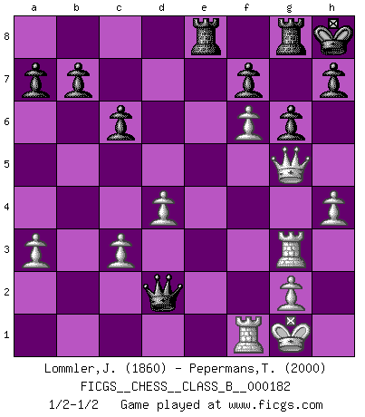 Last move : 1/2-1/2 2012 December 5 16:43:26 [Event "FICGS__CHESS__CLASS_B__000182"] [Site "FICGS"] [Date "2012.11.14"] [Round "1"] [White "Lommler,Jan Peter"] [Black "Pepermans,Toon"] [Result "1/2-1/2"] [WhiteElo "1860"] [BlackElo "2000"] 1.e4 e5 2.Nf3 Nc6 3.Nc3 Nf6 4.Bb5 Bc5 5.Nxe5 Nxe5 6.d4 Bd6 7.f4 Nc6 8.e5 Bb4 9.exf6 Qxf6 10.a3 Ba5 11.Be3 O-O 12.O-O Bxc3 13.bxc3 d5 14.Qf3 Ne7 15.Bd2 Bf5 16.Bd3 Rad8 17.Rae1 Nc8 18.Re5 Bxd3 19.cxd3 Qc6 20.Qg4 Qb5 21.Rg5 g6 22.f5 Qxd3 23.Qf4 Nd6 24.Rg3 Qc2 25.f6 Nf5 26.Qxf5 Qxd2 27.h4 Kh8 28.Qe5 Rde8 29.Qxd5 c6 30.Qc5 Rg8 31.Qg5 1/2-1/2 Four knights : Spanish, Classical defense Kingside Castling by player Black (move 11) Kingside Castling by player White (move 12) This chess game ended in a draw. Follow this game move after move (download)Pawn endings are to Chess what putting is to golf. (Cecil Purdy) Am wohlsten fühle ich mich, wenn ich sehe, wie sich mein Gegner im Todeskampf windet. (Robert James Fischer) El muchacho (en ese entonces un niño de 12 años llamado Anatoly Karpov) no tiene ni idea de lo que es el Ajedrez y no hay futuro en absoluto para el en esta profesión. (Mikhail Botvinnik) Il n'y a plus de joueurs du niveau de Jacob Murray dont la seule quête est le beau jeu, le plaisir de voir les pièces construire quelque chose. Sur 10 idées à la minute, 9 seront sans intérêt, la dernière s'avèrera géniale. (Christian Bauer) The ego is not master in its own house. (Sigmund Freud)
