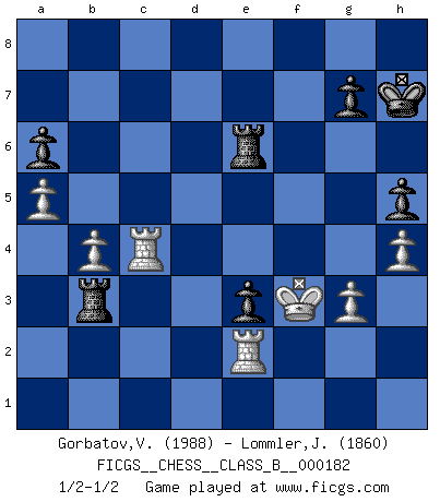 Last move : 1/2-1/2 2013 January 17 18:15:29 [Event "FICGS__CHESS__CLASS_B__000182"] [Site "FICGS"] [Date "2012.11.14"] [Round "1"] [White "Gorbatov,Valentin"] [Black "Lommler,Jan Peter"] [Result "1/2-1/2"] [WhiteElo "1988"] [BlackElo "1860"] 1.e4 c5 2.Nf3 d6 3.Bc4 Nf6 4.Nc3 e6 5.d4 cxd4 6.Nxd4 Qc7 7.Be2 a6 8.O-O b5 9.Be3 Bb7 10.a4 b4 11.Na2 Nxe4 12.f3 Nf6 13.Nxb4 d5 14.Qe1 Bd6 15.Kh1 O-O 16.Rc1 Rc8 17.c3 Nbd7 18.Nd3 Re8 19.Qh4 h6 20.b4 Nf8 21.Qe1 Ng6 22.a5 Bc8 23.f4 Rb8 24.Qd1 Bd7 25.Qc2 Rbc8 26.Nb3 Ba4 27.Qb2 Bxb3 28.Qxb3 Qb7 29.Qa4 Ne4 30.Nf2 d4 31.Bf3 dxe3 32.Nxe4 Qc7 33.Nxd6 Qxd6 34.g3 e5 35.f5 e4 36.fxg6 exf3 37.gxf7+ Kxf7 38.Qb3+ Kg6 39.Qc2+ Kf7 40.Rxf3+ Kg8 41.Qe2 Qd2 42.Rc2 Qxe2 43.Rxe2 Rxc3 44.Rf4 Rb3 45.Kg2 Kh7 46.h4 h5 47.Kf3 Re6 48.Rc4 1/2-1/2 Sicilian Kingside Castling by player White (move 8) Kingside Castling by player Black (move 15) This chess game ended in a draw. Follow this game move after move (download)Chess makes man wiser and clear-sighted. (Vladimir Putin) Es ist peinlich, dass ich nie Weltmeister wurde. Es wäre leicht, Leonid Breschnjew als Ursache vorzuschieben, dessen Apparat den Vorzeigekommunisten Anatoli Karpow in allem unterstützte. Aber Garri Kasparow zum Beispiel, der ebenfalls von den Sowjets unerwünscht war, hat trotz der Widerstände den WM-Titel erobert. (Viktor Kortschnoi) El Ajedrez es imaginación. (David Bronstein) Karpov est une pièce de musée. (Garry Kasparov) Remember : Your focus determines your reality. (Qui-Gon Jinn in Star Wars ep.1)