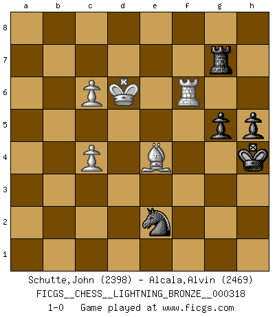 Last move : 1-0 2012 November 14 20:2:16 [Event "FICGS__CHESS__LIGHTNING_BRONZE__000318"] [Site "FICGS"] [Date "2012.11.14"] [Round "1"] [White "Schutte,John"] [Black "Alcala,Alvin"] [Result "1-0"] [WhiteElo "2398"] [BlackElo "2469"] 1.e4 c5 2.Nf3 d6 3.d4 cxd4 4.Nxd4 Nf6 5.Nc3 a6 6.h3 e5 7.Nb3 Be7 8.Be3 Be6 9.f4 b5 10.fxe5 dxe5 11.Qxd8+ Bxd8 12.g4 O-O 13.Nc5 Nc6 14.Nxe6 fxe6 15.O-O-O Nd4 16.Bxd4 exd4 17.Rxd4 Bc7 18.a4 Ra7 19.Be2 Be5 20.Rb4 Nd7 21.Rf1 Bd6 22.Rd4 Be5 23.R4d1 Bxc3 24.bxc3 bxa4 25.Rd6 Nc5 26.Rc6 Nxe4 27.Re1 Ng5 28.Bc4 Nxh3 29.R1xe6 Kh8 30.Rxa6 Rc7 31.Rxa4 g6 32.Re3 Rf4 33.Ra8+ Kg7 34.Bd5 Rf1+ 35.Kb2 Nf4 36.c4 Rd1 37.Rd8 Kf6 38.Rf8+ Kg5 39.Bf3 Rd4 40.Re5+ Kh4 41.c5 Kg3 42.Be4 Kxg4 43.Kc3 Ra4 44.c6 h5 45.Rf6 g5 46.Kb3 R4a7 47.Kb4 Kh4 48.c4 Rg7 49.Kc5 Ra5+ 50.Kd6 Rxe5 51.Kxe5 Ne2 52.Kd6 1-0 Sicilian : Najdorf, Adams attack Kingside Castling by player Black (move 12) Queenside Castling by player White (move 15) 10 pieces endgame at move 51 : White KRBPP , Black KRNPP WHITE : King + 1 Rook 1 Bishop 2 Pawns BLACK : King + 1 Rook 1 Knight 2 Pawns Player White won this chess game. Follow this game move after move (download)A passed Pawn increases in strength as the number of pieces on the board diminishes. (Capablanca) Kasparov ist eine Art Monster mit hundert Augen, denen auch nicht das Geringste entgeht. (Tony Miles) Un buen jugador siempre tiene buena suerte. (José Raúl Capablanca) J'ai vu le vaincu d'Echecs jouer des années durant dans l'espoir de la fête de la victoire. Car tu es plus riche de ce qu'elle existe si même elle n'est point pour toi. Ainsi de la perle du fond des mers. (Antoine de Saint-Exupéry) Those parts of the system that you can hit with a hammer (not advised) are called hardware; those program instructions that you can only curse at are called software. (Anonymous)