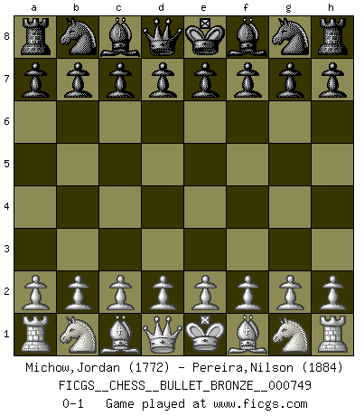 Last move : 0-1 2012 November 15 22:51:25 [Event "FICGS__CHESS__BULLET_BRONZE__000749"] [Site "FICGS"] [Date "2012.11.15"] [Round "1"] [White "Michow,Jordan"] [Black "Pereira,Nilson"] [Result "0-1"] [WhiteElo "1772"] [BlackElo "1884"] 0-1 This chess game has been lost on time (started : 2012.11.15 21:40:45) Player Black won this chess game. Follow this game move after move (download)Bobby is the finest Chess player this country ever produced. His memory for the moves, his brilliance in dreaming up combinations, and his fierce determination to win are uncanny. (John Collins) Die westlichen Werte sind eine Sprache, welche die Putin-Administration nicht versteht. (Garry Kasparov) En el Ajedrez, tal como en la vida, las bendiciones de hoy pueden ser el veneno del mañana. (Assaic) Mais n'est-ce pas déjà le limiter injurieusement que d'appeler les échecs un jeu? N'est-ce pas aussi une science, un art, ou quelque chose qui, comme le cercueil de Mahomet entre ciel et terre, est suspendu entre l'un et l'autre, et qui réunit un nombre incroyable de contraires ? (Stefan Zweig) The problem with troubleshooting is that trouble shoots back. (Anonymous)