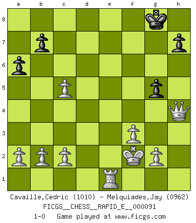 Last move : 1-0 2012 November 21 3:7:42 [Event "FICGS__CHESS__RAPID_E__000091"] [Site "FICGS"] [Date "2012.11.16"] [Round "1"] [White "Cavaille,Cedric"] [Black "Melquiades,Jay"] [Result "1-0"] [WhiteElo "1010"] [BlackElo "0962"] 1.d4 d5 2.Nc3 e6 3.e4 Bb4 4.Bd2 a6 5.exd5 Nf6 6.dxe6 Bxe6 7.Be2 Nd5 8.Nxd5 Bxd5 9.f3 Bxd2+ 10.Qxd2 Nc6 11.Qe3+ Ne7 12.Qg5 g6 13.Qf6 Rg8 14.Nh3 c5 15.dxc5 Rc8 16.O-O Rc6 17.Qd4 Nf5 18.Qe5+ Be6 19.Nf4 f6 20.Qc3 Qc7 21.Qxf6 Ng7 22.Nxe6 Rxe6 23.Qd4 Nf5 24.Qa4+ Kf7 25.Bc4 Ne3 26.Bxe6+ Kg7 27.Bxg8 Nxf1 28.Kxf1 Kxg8 29.Qd4 Qxh2 30.Kf2 g5 31.Re1 Qh4+ 32.Qxh4 1-0 Queen's pawn : Chigorin variation Kingside Castling by player White (move 16) Player White won this chess game. Follow this game move after move (download)In the perfect Chess combination as in a first-rate short story, the whole plot and counter-plot should lead up to a striking finale, the interest not being allayed until the very last moment. (Yates and Winter) Die FIDE ist dabei in die Hände der russischen Mafia zu fallen. (Larry Evans) A través de las casillas del tablero, los Indios explican el movimiento del tiempo y la edad, las influencias mas altas que controlan el mundo y los lazos que vinculan al Ajedrez con el alma humana. (Al-Masudi) Nous vivons dans un monde échiquéen : chaque jour qui passe est un défi à relever. (Philosophe Sasha) He is a liar. I just don't know what the lie is yet. (Horatio Caine, C.S.I. Miami)