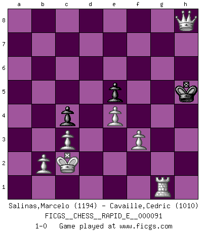 Last move : 1-0 2013 January 8 16:34:34 [Event "FICGS__CHESS__RAPID_E__000091"] [Site "FICGS"] [Date "2012.11.16"] [Round "1"] [White "Salinas,Marcelo"] [Black "Cavaille,Cedric"] [Result "1-0"] [WhiteElo "1194"] [BlackElo "1010"] 1.Nc3 Nf6 2.e4 d6 3.Bb5+ Bd7 4.Qe2 a6 5.Bxd7+ Qxd7 6.Qc4 b5 7.Qd3 e6 8.Qf3 Be7 9.Qg3 O-O 10.d3 c5 11.Bh6 Nh5 12.Qg4 Bf6 13.Qxh5 gxh6 14.Qxh6 Bg7 15.Qf4 e5 16.Qf5 Qe7 17.Nd5 Qd8 18.Nf3 Qd7 19.Qg5 h6 20.Nf6+ Kh8 21.Nxd7 hxg5 22.Nxf8 Bxf8 23.Nxg5 f6 24.Ne6 Bh6 25.Nc7 Ra7 26.Nd5 Nc6 27.Nxf6 Nd4 28.Kd1 a5 29.Ne8 Rd7 30.c3 Nc6 31.Nf6 Rf7 32.Ng4 Kg7 33.f3 Ne7 34.a4 bxa4 35.Rxa4 Ng6 36.Rxa5 Nf4 37.Ra6 Nxd3 38.Nxh6 Kxh6 39.Rxd6+ Kg5 40.Rxd3 c4 41.Rd5 Kf6 42.h4 Ra7 43.Rd6+ Ke7 44.Kc2 Kxd6 45.h5 Rh7 46.g4 Rf7 47.h6 Rh7 48.g5 Ke6 49.g6 Re7 50.h7 Rxh7 51.gxh7 Kf6 52.h8Q+ Kg5 53.Qf8 Kg6 54.Rg1+ Kh5 55.Qh8+ 1-0 Dunst (Sleipner, Heinrichsen) Opening Kingside Castling by player Black (move 9) 10 pieces endgame at move 51 : White KRPPPPP , Black KPP WHITE : King + 1 Rook 5 Pawns BLACK : King + 2 Pawns Promotion Queen by player White (move 52) Player White won this chess game. Follow this game move after move (download)Fischer sacrificed virtually everything most of us weakies (to use his term) value, respect, and cherish, for the sake of an artful, often beautiful board game, for the ambivalent privilege of being its greatest master. (Paul Kollar) In der Schule lernt man nichts. Es ist nur Zeitverschwendung. (Robert James Fischer) Existen dos clases de sacrificios: los correctos y los míos. (Mikhail Tal) L'attaque fait le spectacle, la défense gagne les matchs. (Dicton footballistique) The arrogant army will lose certainly the battle. (Chinese proverb)