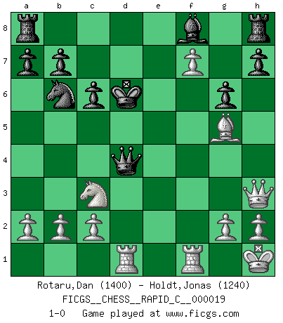 Last move : 1-0 2007 February 14 4:26:7 [Event "FICGS__CHESS__RAPID_C__000019"] [Site "FICGS"] [Date "2007.01.18"] [Round "1"] [White "Rotaru,Dan"] [Black "Holdt,Jonas"] [Result "1-0"] [WhiteElo "1400"] [BlackElo "1240"] 1.e4 d5 2.exd5 Qxd5 3.Nc3 Qa5 4.d4 c6 5.Bc4 Bf5 6.Nge2 e6 7.O-O Nf6 8.Ng3 Bg4 9.f3 Qb4 10.Qe2 Bh5 11.Nxh5 Nxh5 12.f4 Nd7 13.f5 Nb6 14.fxe6 Qxc4 15.exf7+ Kd7 16.Qxh5 Qxd4+ 17.Kh1 g6 18.Qh3+ Ke7 19.Bg5+ Kd6 20.Rad1 1-0 Scandinavian (centre counter) defense Kingside Castling by player White (move 7) Player White won this chess game. Follow this game move after move (download)Excellence at Chess is one mark of a scheming mind. (Sir Arthur Conan Doyle) Im Internet Chess Club betrug mein Rating vorübergehend 3350 ELO-Punkte. (Sergej Karjakin) El Ajedrez expande y enriquece tu mente. (Saudin Robovic) Avec des compensations pour le matériel en plus... (Anonyme) Kids, you tried your best and you failed miserably. The lesson is, never try. (Simpsons)