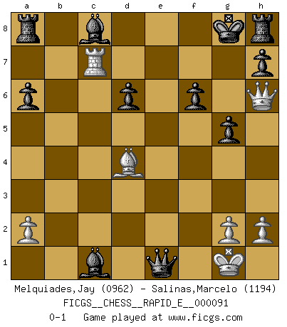 Last move : 0-1 2012 December 16 1:48:5 [Event "FICGS__CHESS__RAPID_E__000091"] [Site "FICGS"] [Date "2012.11.16"] [Round "1"] [White "Melquiades,Jay"] [Black "Salinas,Marcelo"] [Result "0-1"] [WhiteElo "0962"] [BlackElo "1194"] 1.e4 e5 2.Nf3 Nc6 3.d4 exd4 4.Bg5 f6 5.Bh4 Bb4+ 6.c3 dxc3 7.bxc3 Ba5 8.Bb5 g5 9.Bg3 Nge7 10.O-O a6 11.Bxc6 Nxc6 12.Nd4 d6 13.Qh5+ Kf8 14.Nxc6 bxc6 15.Nd2 Qe7 16.f4 Bxc3 17.Rac1 Bxd2 18.Rxc6 Be3+ 19.Bf2 Bxf4 20.Rfc1 Bxc1 21.Qh6+ Kg8 22.Bd4 Qxe4 23.Rxc7 Qe1+ 0-1 Scotch Opening Kingside Castling by player White (move 10) Player Black won this chess game. Follow this game move after move (download)Could we look into the head of a Chess player, we should see there a whole world of feelings, images, ideas, emotion and passion. (Alfred Binet) Der Knackpunkt bei der Konzentration ist, daß wir nur durch sie etwas Neues und Ungewöhnliches am Schachbrett finden können. Sie ist der einzige Weg durch neue neue Ideen eine Überraschung zu bereiten. (Garry Kasparov) Si tu oponente te ofrece un empate, trata de averiguar porque piensa él que esta en una posición peor. (Nigel Short) La victoire dans une partie d'Echecs appartient la plupart du temps à celui qui voit un peu plus loin que l'adversaire. (Lasker) Now be brave and don't look back. Don't look back. (Shmi Skywalker in Star Wars ep.1)