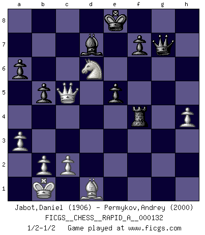Last move : 1/2-1/2 2013 March 11 15:57:40 [Event "FICGS__CHESS__RAPID_A__000132"] [Site "FICGS"] [Date "2012.11.17"] [Round "1"] [White "Jabot,Daniel"] [Black "Permykov,Andrey"] [Result "1/2-1/2"] [WhiteElo "1906"] [BlackElo "2000"] 1.e4 c5 2.Nf3 d6 3.d4 cxd4 4.Nxd4 Nf6 5.Nc3 a6 6.Bg5 e6 7.f4 Qb6 8.Nb3 Be7 9.Qf3 Nbd7 10.Bd3 Qc7 11.O-O-O b5 12.a3 Rb8 13.g4 h6 14.Qh3 Nb6 15.Bh4 e5 16.f5 Bb7 17.Rhg1 Na4 18.Bxf6 Bxf6 19.g5 Nxc3 20.gxf6 Nxd1 21.fxg7 Rg8 22.Kxd1 Qb6 23.Rg4 d5 24.exd5 Bxd5 25.Nd2 Qf6 26.Qg3 Rd8 27.Kc1 Bc6 28.h4 h5 29.Rg5 Rd4 30.Be2 Rf4 31.Bxh5 Ke7 32.Bd1 Rxf5 33.Rg4 Rf4 34.Rg5 Rf5 35.Rg4 Qh6 36.Qc3 Bd7 37.Kb1 Rxg7 38.Qc5+ Ke8 39.Rxg7 Qxg7 40.Ne4 Rf4 41.Nd6+ 1/2-1/2 Sicilian : Najdorf, 7...Qb6 Queenside Castling by player White (move 11) This chess game ended in a draw. Follow this game move after move (download)It is not enough to be a good player... you must also play well. (Siegbert Tarrasch) Modernes Schach sorgt sich zuviel um Dinge wie Bauernstruktur usw. Vergessen Sie das, Schachmatt beendet das Spiel! (Nigel Short) Hay jugadores fuertes y personas amables y yo soy un jugador fuerte. (Bobby Fischer) Le temps de noter son nom sur la feuille de partie, j'étais déjà en zeitnot ! D'un modeste amateur apparié lors de la première ronde d'un open contre le grand-maître Azmaïparashvili. Creativity involves breaking out of established patterns in order to look at things in a different way. (Edward De Bono)