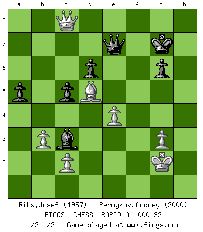 Last move : 1/2-1/2 2013 January 5 19:38:55 [Event "FICGS__CHESS__RAPID_A__000132"] [Site "FICGS"] [Date "2012.11.17"] [Round "1"] [White "Riha,Josef"] [Black "Permykov,Andrey"] [Result "1/2-1/2"] [WhiteElo "1957"] [BlackElo "2000"] 1.e4 c5 2.Nf3 d6 3.d4 cxd4 4.Nxd4 Nf6 5.Nc3 a6 6.Bg5 e6 7.f4 Qb6 8.Qd2 Qxb2 9.Rb1 Qa3 10.f5 Nc6 11.fxe6 fxe6 12.Nxc6 bxc6 13.Be2 Be7 14.O-O O-O 15.Rb3 Qc5+ 16.Be3 Qe5 17.Bf4 Qc5+ 18.Kh1 Ng4 19.h3 e5 20.Na4 Qa7 21.hxg4 exf4 22.Nb6 Be6 23.Nxa8 Bxb3 24.axb3 Qxa8 25.Rxf4 Rxf4 26.Qxf4 a5 27.Bc4+ Kh8 28.g5 g6 29.Qd2 h5 30.gxh6 Kh7 31.g3 Qd8 32.Kg2 Bf6 33.Qf4 Bg5 34.Qg4 Kxh6 35.Bd3 c5 36.Qe6 Qe7 37.Qh3+ Kg7 38.Qg4 Kh6 39.Qe2 Qe5 40.Qe1 Bd8 41.Qh1+ Kg7 42.Qh3 Bf6 43.Qc8 Qe7 44.Qa8 Qc7 45.Bc4 Qe7 46.Bd5 Bc3 47.Qc8 1/2-1/2 Sicilian : Najdorf, 7...Qb6 Kingside Castling by player White (move 14) Kingside Castling by player Black (move 14) This chess game ended in a draw. Follow this game move after move (download)Examine moves that smite! A good eye for smites is far more important than a knowledge of strategical principles. (Purdy) Ja, ich habe einmal eine Blitzpartie gespielt, es war in einem Zug, 1929. --im Interview 1989 (Mikhail Moiseyevich Botvinik) Yo no creo en la psicología. Yo creo en las buenas movidas. (Bobby Fischer) Les échecs, c'est l'art d'analyser. (Mikhail Botvinnik) The existence of forgetting has never been proved: We only know that some things don't come to mind when we want them. (Friedrich Nietzsche)