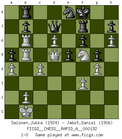 Last move : 1-0 2013 March 3 22:55:48 [Event "FICGS__CHESS__RAPID_A__000132"] [Site "FICGS"] [Date "2012.11.17"] [Round "1"] [White "Salonen,Jukka"] [Black "Jabot,Daniel"] [Result "1-0"] [WhiteElo "1924"] [BlackElo "1906"] 1.e4 c5 2.Nf3 d6 3.d4 cxd4 4.Nxd4 Nf6 5.Nc3 g6 6.Be3 Bg7 7.f3 O-O 8.Qd2 Nc6 9.O-O-O Bd7 10.g4 Nxd4 11.Bxd4 Ne8 12.Bxg7 Kxg7 13.h4 Kg8 14.h5 e6 15.e5 g5 16.h6 f6 17.exd6 Rc8 18.Bb5 Bxb5 19.Nxb5 Qd7 20.Nc3 e5 21.Qd5+ Kh8 22.Rd3 Rg8 23.Kb1 Rg6 24.Ne4 Rg8 25.Ng3 Rd8 26.Rhd1 Rf8 27.Nf5 Rc8 28.a3 Rb8 29.Rc3 Rf7 30.Rc5 Ra8 31.Ra5 a6 32.Rc5 Rb8 33.Rd3 Rf8 34.a4 Rf7 35.Rb3 Rd8 36.Rb6 Rb8 37.Rc4 Kg8 38.Rcb4 a5 39.R4b5 Kf8 40.c4 1-0 Sicilian : Dragon, Yugoslav attack, 7...O-O Kingside Castling by player Black (move 7) Queenside Castling by player White (move 9) Player White won this chess game. Follow this game move after move (download)No one ever won a game by resigning. (Unknown) Es ist nicht das erste mal, dass sich die FIDE dem Arabischen Geld gebeugt hat (über die FIDE WM 2004 in Lybien). (Larry Evans) Por la belleza de sus partidas, la claridad de su juego y lo brillante de sus ideas, Fischer se creó el mismo como un artista de la misma estatura como Brahms, Rembrandt y Shakespeare. (David Levy) Les Echecs, c'est l'art de la guerre sans les charniers, c'est la résurrection des morts tombés au champ d'honneur, l'espoir perpétuel, la suprématie de l'intelligence sur la force, la culture de l'esprit. (F. Szpiner) You can only get smarter by playing a smarter opponent. (Revolver, movie)
