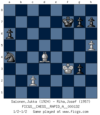 Last move : 1/2-1/2 2012 December 3 15:50:50 [Event "FICGS__CHESS__RAPID_A__000132"] [Site "FICGS"] [Date "2012.11.17"] [Round "1"] [White "Salonen,Jukka"] [Black "Riha,Josef"] [Result "1/2-1/2"] [WhiteElo "1924"] [BlackElo "1957"] 1.e4 e6 2.d4 d5 3.e5 c5 4.Nf3 cxd4 5.Nxd4 Nd7 6.f4 Nh6 7.Nc3 Bb4 8.Be2 Nb6 9.O-O O-O 10.a3 Bxc3 11.bxc3 Bd7 12.Rb1 Qc7 13.Rf3 f6 14.exf6 Rxf6 15.Bd3 Nc4 16.Bxc4 dxc4 17.Qe2 Nf5 18.Rf1 b6 19.Nf3 Bc6 20.Ne5 Bd5 21.a4 Qc5+ 22.Rf2 Rd8 23.Rb5 Qc7 24.Ba3 Nh4 25.g3 Ng6 26.Ng4 Rf7 27.h4 Ba8 28.Kh2 Qc6 29.Kh3 Qh1+ 30.Rh2 Rd2 31.Rxh1 Rxe2 32.Rh2 Rxh2+ 33.Nxh2 Bc6 34.Rb4 e5 35.h5 Bd7+ 36.Kg2 Ne7 37.Rxc4 Be6 38.Rc7 Nd5 39.Rxf7 Bxf7 40.Ng4 exf4 41.c4 Nc3 42.Ne5 fxg3 43.c5 bxc5 44.Nxf7 Kxf7 45.Bxc5 a6 46.Kf3 Nxa4 47.Bd4 1/2-1/2 French : Advance, Nimzovich system Kingside Castling by player White (move 9) Kingside Castling by player Black (move 9) 10 pieces endgame at move 46 : White KBPP , Black KNPPPP WHITE : King + 1 Bishop 2 Pawns BLACK : King + 1 Knight 4 Pawns This chess game ended in a draw. Follow this game move after move (download)Look at Garry Kasparov. After he loses, invariably he wins the next game. He just kills the next guy. That's something that we have to learn to be able to do. (Maurice Ashley) Du weisst es gibt ein Problem mit Computern und Fernschach, wenn jeder eine Rating von 2450 hat. (John Christen Knudsen) Debemos de asegurarnos de que el Ajedrez no se convierta en un lenguaje muerto, muy interesante, pero tan solo para un grupo muy pequeño. (Sytze Faber) Si le désir cupide (et stupide) de gagner est une inépuisable source de souffrance, une combinaison brillante sur l'échiquier est une découverte : le coquelicot qui s'épanouit lorsque apparaît la Voie Lactée. (Arrabal) Luck never gives; it only lends. (Swedish proverb)