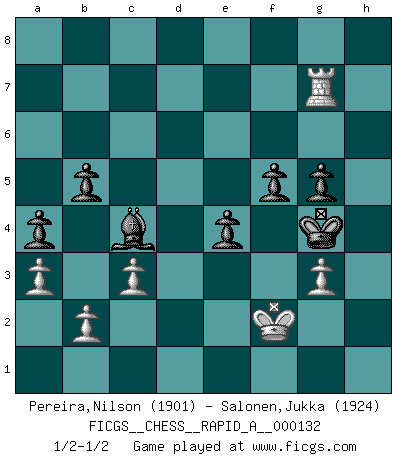 Last move : 1/2-1/2 2013 March 7 10:2:48 [Event "FICGS__CHESS__RAPID_A__000132"] [Site "FICGS"] [Date "2012.11.17"] [Round "1"] [White "Pereira,Nilson"] [Black "Salonen,Jukka"] [Result "1/2-1/2"] [WhiteElo "1901"] [BlackElo "1924"] 1.e4 c5 2.Nf3 d6 3.d4 cxd4 4.Nxd4 Nf6 5.Nc3 Nc6 6.Bg5 e6 7.Qd2 Be7 8.O-O-O Nxd4 9.Qxd4 O-O 10.f4 Qa5 11.Bc4 Bd7 12.e5 dxe5 13.fxe5 Bc6 14.Bd2 Nd7 15.Nd5 Qc5 16.Nxe7+ Qxe7 17.Rhe1 Nb6 18.Bf1 Rfd8 19.Qg4 Rac8 20.Kb1 Qc5 21.Bd3 Na4 22.Qh4 g6 23.Bc1 Rd7 24.Ka1 b5 25.c3 Rcd8 26.Be3 Qxe5 27.Bd4 Rxd4 28.Qxd8+ Rxd8 29.Rxe5 Kg7 30.Bc2 Rxd1+ 31.Bxd1 Kf6 32.Re2 Nb6 33.Kb1 h5 34.Bb3 a5 35.a3 a4 36.Ba2 h4 37.Kc2 Ke7 38.Kd3 Nd5 39.g3 hxg3 40.hxg3 Nf6 41.Kd4 Kd6 42.Rf2 e5+ 43.Kd3 Ke7 44.Rf1 Nd5 45.Re1 Kd6 46.Re2 f5 47.Bxd5 Bxd5 48.Rh2 Bc4+ 49.Ke3 Ke6 50.Rh4 Kf6 51.Rh7 Kg5 52.Kf3 Bd5+ 53.Kf2 Kg4 54.Re7 e4 55.Rd7 Bc4 56.Rg7 g5 1/2-1/2 Sicilian : Richter-Rauzer, Rauzer attack, 7...Be7 Queenside Castling by player White (move 8) Kingside Castling by player Black (move 9) This chess game ended in a draw. Follow this game move after move (download)Chess is life. (Bobby Fischer) Schachspieler können ausgezeichnet Varianten am Schachbrett berechnen, aber nicht im realen Leben. Zu stark ist der Individualismus im Schach ausgeprägt, und für viele ist ein kleiner momentaner persönlicher Vorteil wichtiger als ein weit größerer Vorteil von morgen. (Anatoly Karpov) ¿Que sería del Ajedrez sin errores graciosos?. (Kurt Richter) La victoire dans une partie d'Echecs appartient la plupart du temps à celui qui voit un peu plus loin que l'adversaire. (Lasker) I feel so... helpless. (C-3PO in Star Wars ep.3)