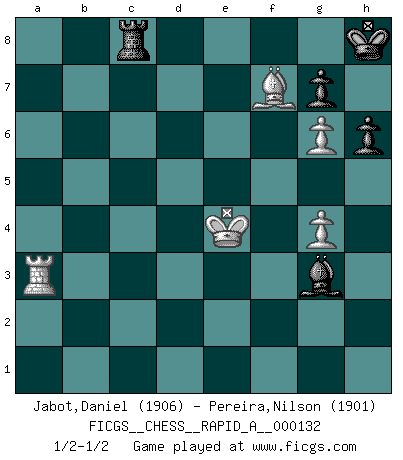 Last move : 1/2-1/2 2013 April 4 3:18:8 [Event "FICGS__CHESS__RAPID_A__000132"] [Site "FICGS"] [Date "2012.11.17"] [Round "1"] [White "Jabot,Daniel"] [Black "Pereira,Nilson"] [Result "1/2-1/2"] [WhiteElo "1906"] [BlackElo "1901"] 1.e4 c5 2.Nf3 d6 3.d4 cxd4 4.Nxd4 Nf6 5.Nc3 a6 6.Bg5 e6 7.f4 Qb6 8.Qd2 Qxb2 9.Rb1 Qa3 10.f5 Nc6 11.fxe6 fxe6 12.Nxc6 bxc6 13.Be2 Be7 14.O-O O-O 15.Rb3 Qc5+ 16.Be3 Qe5 17.Bf4 Qc5+ 18.Be3 Qe5 19.Bf4 Qc5+ 20.Kh1 Ng4 21.h3 e5 22.Na4 Qa7 23.hxg4 exf4 24.Bc4+ Kh8 25.Nb6 d5 26.exd5 cxd5 27.Bxd5 Rb8 28.Nxc8 Rbxc8 29.Rh3 Qb6 30.c4 Qf6 31.g3 Bd6 32.g5 Qf5 33.g4 Qg6 34.Qd4 Rfe8 35.Qd3 Qxd3 36.Rxd3 Re3 37.Rfd1 Be7 38.g6 Rb8 39.Rxe3 fxe3 40.Kg2 Rb2+ 41.Kf3 Bc5 42.Bf7 Rf2+ 43.Ke4 Rd2 44.Rh1 h6 45.Rb1 Ba7 46.Re1 Rxa2 47.c5 Rc2 48.Rxe3 Bxc5 49.Rb3 Bd6 50.Rb6 Bg3 51.Rxa6 Rc8 52.Ra3 1/2-1/2 Sicilian : Najdorf, 7...Qb6 Kingside Castling by player White (move 14) Kingside Castling by player Black (move 14) 10 pieces endgame at move 51 : White KRBPP , Black KRBPP WHITE : King + 1 Rook 1 Bishop 2 Pawns BLACK : King + 1 Rook 1 Bishop 2 Pawns This chess game ended in a draw. Follow this game move after move (download)The passed Pawn is a criminal, who should be kept under lock and key. Mild measures, such as police surveillance, are not sufficient. (Aaron Nimzovich) Wie kann ich Remis annehmen? Ich weiß ja gar nicht, wie ich stehe! (Fritz Sämisch) Cuando veas una buena jugada, trata de encontrar otra mejor. (Emanuel Lasker) A ce moment-là, je menaçais de comprendre la position ! (Clément L'Heureux) For to win one hundred victories in one hundred battles is not the acme of skill. To subdue the enemy without fighting is the acme of skill. (Sun Tzu)