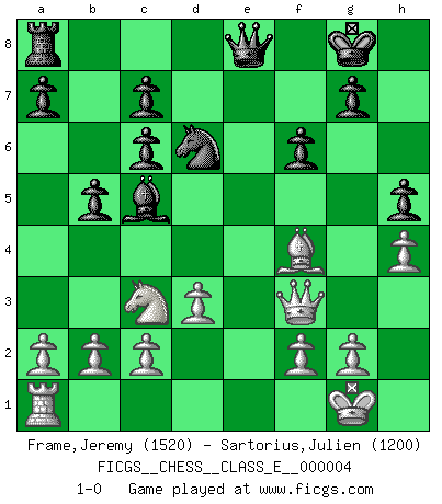 Last move : 1-0 2006 August 7 4:2:49 [Event "FICGS__CHESS__CLASS_E__000004"] [Site "FICGS"] [Date "2006.05.16"] [Round "1"] [White "Frame,Jeremy"] [Black "Sartorius,Julien"] [Result "1-0"] [WhiteElo "1520"] [BlackElo "1200"] 1.e4 e5 2.Nf3 Nc6 3.Bb5 Bc5 4.O-O Nf6 5.Bxc6 dxc6 6.Nxe5 Nxe4 7.d3 Nd6 8.Re1 O-O 9.Nc3 f6 10.Nf3 h5 11.Bf4 Re8 12.h4 b5 13.Rxe8+ Qxe8 14.Qd2 Bg4 15.Qe2 Bxf3 16.Qxf3 1-0 Ruy Lopez : Classical (Cordel) defense Kingside Castling by player White (move 4) Kingside Castling by player Black (move 8) Player White won this chess game. Follow this game move after move (download)I played Chess with him and would have beaten him sometimes only he always took back his last move, and ran the game out differently. (Mark Twain) Wenn Du einsam bist, wenn Du Dich in der Welt wie ein Fremder fühlst, spiele Schach. Das wird Deinen Geist erheben und Dein Ratgeber im Kampf sein. (Aristoteles) La pasion por jugar al Ajedrez es una de las mas inexplicables en el mundo. (H.G. Wells) On peut tirer plus d'utilité d'une partie perdue que de 100 parties gagnées. (Capablanca) If only faces could talk... (Pat Summerall, Sportscaster during the Super Bowl)