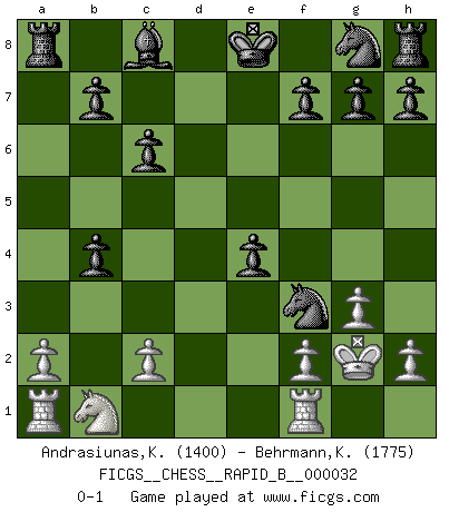 Last move : 0-1 2007 March 23 13:57:1 [Event "FICGS__CHESS__RAPID_B__000032"] [Site "FICGS"] [Date "2007.01.18"] [Round "1"] [White "Andrasiunas,Kestutis"] [Black "Behrmann,Klaus"] [Result "0-1"] [WhiteElo "1400"] [BlackElo "1775"] 1.b4 c6 2.d4 d5 3.g3 e5 4.Bg2 Bxb4+ 5.Bd2 Bxd2+ 6.Qxd2 Nd7 7.Nf3 e4 8.Qb4 exf3 9.Bxf3 Qf6 10.Nc3 a5 11.Qa3 Qxd4 12.O-O Qb4 13.Qxb4 axb4 14.Nb1 Ne5 15.e4 Nxf3+ 16.Kg2 dxe4 0-1 This chess game has been lost on time (started : 2007.01.18 17:34:17) Polish : Outflank variation Kingside Castling by player White (move 12) Player Black won this chess game. Follow this game move after move (download)Every Chess master was once a beginner. (Chernev) Ja, jede Frau in Holland liebt mich bestimmt, und alle Männer hassen mich. (Loek van Wely) Aunque la mayoría de la gente disfruta observar las partidas de los grandes Maestros de ataque, algunos de los jugadores mas notables en la historia han sido los jugadores silenciosos posicionales. Lentamente ellos te aplastan despojandote de tu espacio, congestionando tus piezas y dejandote virtualmente sin nada que hacer. (Yasser Seirawan) Mais n'est-ce pas déjà le limiter injurieusement que d'appeler les échecs un jeu? N'est-ce pas aussi une science, un art, ou quelque chose qui, comme le cercueil de Mahomet entre ciel et terre, est suspendu entre l'un et l'autre, et qui réunit un nombre incroyable de contraires ? (Stefan Zweig) Computers are like Old Testament gods; lots of rules and no mercy. (Joseph Campbell)