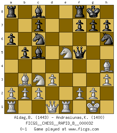 Last move : 0-1 2007 March 14 19:48:2 [Event "FICGS__CHESS__RAPID_B__000032"] [Site "FICGS"] [Date "2007.01.18"] [Round "1"] [White "Aldag,Benjamin"] [Black "Andrasiunas,Kestutis"] [Result "0-1"] [WhiteElo "1443"] [BlackElo "1400"] 1.e4 d5 2.exd5 Qxd5 3.Nc3 Qd7 4.Bc4 Nc6 5.d3 a6 6.Nf3 Nf6 7.O-O b5 8.Bb3 e5 9.Re1 Bc5 10.Bg5 Ng4 11.Bh4 O-O 12.h3 Nh6 13.Nxe5 Qf5 0-1 This chess game has been lost on time (started : 2007.01.18 17:34:17) Scandinavian (centre counter) defense Kingside Castling by player White (move 7) Kingside Castling by player Black (move 11) Player Black won this chess game. Follow this game move after move (download)You cannot play at Chess if you are kind-hearted. (French Proverb) Ich liebe den Moment, wenn ich das Ego meines Gegenüber breche. (Robert James Fischer) Si el ingenio solamente fuese necesario para lucirse, las mujeres serían las mejores jugadoras de Ajedrez del mundo. (Albin) Que feriez-vous si vous étiez en train de jouer aux échecs et que la fin du monde arrive ? Je continuerais à jouer. (Saint Borromée) CHESS, n. f. [echecs, Fr.] A nice and abstruse game, in which two sets of puppets are moved in opposition to each other. (Dr Samuel Johnson, A Dictionary Of The English Language, 1755)