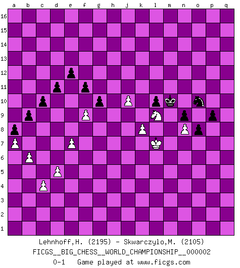 Last move : 0-1 2014 April 25 0:54:10 [Event "FICGS__BIG_CHESS__WORLD_CHAMPIONSHIP__000002"] [Site "FICGS"] [Date "2012.11.18"] [Round "1"] [White "Lehnhoff,Heinz-Georg"] [Black "Skwarczylo,Marek"] [Result "0-1"] [WhiteElo "2195"] [BlackElo "2105"] 1.h2-g4 e15-e13 2.j2-k4 p16-o14 3.m2-m4 j15-k13 4.h1-o7 h15-g13 5.e2-e4 b16-c14 6.d2-d4 f16-c13 7.c2-c3 d15-d14 8.p1-q3 m15-m13 9.l1-p5 k16-h15 10.n2-n4 h16-p9 11.c1-l9 g16-j15 12.b1-a3 l16-p12 13.k1-h2 n15-n14 14.o2-o3 o16-g9 15.m4-m5 p12-m9 16.o7-q7 c16-k9 17.f1-b5 m16-m14 18.o1-f9 m9-l10 19.e4-e5 q16-m16 20.q3-o4 e16-e14 21.o4-n6 l10-m11 22.q7-b7 c13-b14 23.q2-q4 a16-e16 24.a3-c4 m14-l14 25.l9-n7 p9-n11 26.g1-j2 e14-f14 27.j2-g3 l14-l12 28.a2-a4 l12-f12 29.f9-c6 f12-f7 30.n7-l9 n11-q11 31.b7-b10 f14-f12 32.c4-d6 f7-f10 33.b10-g5 f10-j10 34.g3-j4 m11-p14 35.f2-f3 m16-m14 36.j1-j2 m14-l14 37.l2-l3 g9-j7 38.l9-j7 b14-j7 39.g5-e7 l14-m14 40.c6-d5 j10-j13 41.n6-m8 k9-d15 42.m8-l6 j7-b14 43.h2-k3 c14-d12 44.d5-e4 p14-e4 45.d6-e4 d12-f11 46.e4-f6 q11-q10 47.k3-m4 q15-q13 48.p2-p4 o14-n12 49.m4-o5 p15-p13 50.p5-n7 q10-h10 51.e7-g7 h10-h8 52.g7-h8 b14-h8 53.m5-m6 o15-o13 54.j2-h2 q13-q12 55.m1-m5 p13-p12 56.q1-m1 q12-q11 57.q4-q5 m14-l14 58.m5-h5 h8-b14 59.m1-m5 d15-c14 60.m5-j5 f11-g9 61.l6-m4 p12-p11 62.j5-j13 h15-j13 63.e1-e4 n14-n13 64.a1-e1 q11-q10 65.g4-j5 o13-o12 66.e4-h4 l14-l10 67.e1-e4 l15-l14 68.k4-m5 f15-f14 69.m5-l7 n12-l11 70.e4-g4 n13-n12 71.b2-b4 q10-q9 72.k2-k4 p11-p10 73.l3-l4 o12-o11 74.l4-l5 j15-h13 75.f6-e4 f12-m12 76.e4-c5 l10-b10 77.b5-d3 b14-e11 78.h5-h10 b10-h10 79.h4-h10 d14-d13 80.j4-k6 d13-d12 81.h10-a10 a15-a14 82.d3-e4 e16-d16 83.e4-a8 j16-k16 84.n7-q10 k16-l16 85.n4-n5 l11-n10 86.o3-o4 m12-g12 87.o5-n7 g9-e8 88.a8-e4 g12-g4 89.j5-g4 e8-c9 90.a10-a11 j13-l12 91.n7-m9 l16-m15 92.q10-n7 d16-d13 93.a4-a5 d13-b13 94.g4-f6 b13-b11 95.a11-b11 c9-b11 96.p4-p5 c14-f11 97.q5-q6 c15-c13 98.e4-d5 c13-c12 99.m9-o10 h13-j11 100.g2-g4 c12-c11 101.f3-f4 b15-b13 102.h3-h4 b11-d10 103.h2-h3 a14-a13 104.j3-j4 b13-b12 105.k4-k5 b12-b11 106.j4-j5 a13-a12 107.h3-j4 a12-a11 108.h4-h5 a11-a10 109.l5-l6 b11-b10 110.m4-n6 a10-a9 111.n6-m8 n10-m8 112.n7-m8 l12-m10 113.m8-l9 m10-o9 114.o4-o5 n12-n11 115.o10-p12 j11-l12 116.l7-m9 n11-n10 117.m9-o10 m15-n14 118.d5-e4 k13-m14 119.o10-m11 m14-n12 120.p12-o10 n12-o10 121.m11-o10 l12-n13 122.p5-p6 g13-j12 123.p6-p7 e11-g13 124.k6-m7 g13-l9 125.m7-l9 o9-m10 126.m6-m7 f11-g12 127.g4-g5 g12-k9 128.n5-n6 k9-e4 129.c5-e4 n14-o13 130.k5-k6 m10-n12 131.o10-n8 o13-o12 132.j4-k5 o12-n11 133.l6-l7 o11-o10 134.o5-o6 n13-o11 135.o6-o7 o10-o9 136.n8-o6 n11-m10 137.l9-k7 n10-n9 138.k5-l6 n12-o10 139.k7-m6 m10-n10 140.l7-l8 p10-p9 141.n6-n7 m13-m12 142.k6-k7 m12-m11 143.m7-m8 m11-m10 144.m8-m9 n10-m11 145.q6-q7 l14-l13 146.f6-h7 l13-l12 147.h7-j9 k15-k13 148.j5-j6 k13-k12 149.l6-l7 k12-k11 150.n7-n8 o9-o8 151.p7-p8 q9-p8 152.q7-p8 o11-m12 153.j9-h11 j14-j13 154.k7-k8 l12-l11 155.l8-l9 l11-l10 156.l7-l8 d10-f9 157.e4-f6 f9-g7 158.g5-g6 g7-e6 159.f6-d5 m12-k13 160.o6-q7 o10-q11 161.h11-j9 k13-h12 162.j6-j7 j12-h10 163.h5-h6 h10-j8 164.h6-h7 j8-g7 165.l8-k7 g7-f5 166.m6-l4 e6-f8 167.l4-j5 j13-j12 168.j7-j8 h12-j10 169.m9-l10 k11-l10 170.l9-m10 j10-h8 171.k7-l8 m11-m10 172.q7-o6 q11-p13 173.o6-m7 p13-o11 174.g6-g7 f5-g7 175.d5-e7 g7-h5 176.f4-f5 h5-j7 177.l8-l7 j7-k5 178.l7-l6 k5-m4 179.l6-k6 m4-n6 180.k6-j7 f8-g10 181.j9-g10 h8-g10 182.j5-k7 g10-h12 183.e7-f9 h14-h13 184.f9-g11 g15-g14 185.h7-h8 f14-f13 186.h8-h9 d12-d11 187.m7-l9 o11-m12 188.j8-j9 m12-k11 189.l9-j8 k11-m12 190.j8-l9 h12-k11 191.l9-j8 m12-n10 192.j8-k6 n10-m8 193.k6-l8 m10-n10 194.k7-m8 n6-m8 195.l8-m6 n10-m11 196.g11-j10 m11-l12 197.j10-h8 l12-m11 198.h8-k7 m8-k7 199.j7-k7 k11-m10 200.f5-f6 m10-k9 201.a5-a6 k9-m8 202.k7-l8 m11-m10 203.a6-a7 b10-b9 204.b4-b5 a9-a8 205.b5-b6 c11-c10 206.d4-d5 j12-j11 207.l8-l7 h13-h12 208.m6-l8 m10-n10 209.l8-m6 h12-h11 210.l7-l8 n10-m10 211.f6-f7 g14-g13 212.e5-e6 g13-g12 213.f7-f8 g12-g11 214.f8-f9 f13-f12 215.e6-e7 f12-f11 216.c3-c4 j11-j10 217.h9-j10 h11-j10 218.l8-l7 g11-g10 219.m6-l8 m10-n10 220.l8-k10 m8-o7 221.k10-j8 o7-q6 222.j8-l9 n10-m10 223.l9-j10 e13-e12 224.j10-l9 q6-p8 225.j9-j10 p8-o10 0-1 Follow this game move after move (download)Pawns: they are the soul of this game, they alone form the attack and defense. (Philidor) Ein Kibitz ist einer, der deinem Gegner gute Ratschläge gibt. (Andrew Soltis) Yo nunca en mi vida he jugado la Defensa Francesa, que viene siendo la más aburrida de todas las Aperturas. (Wilhelm Steinitz) Donnez-moi un Cavalier en 6e et je gagnerais toutes mes parties. (Steinitz) There are more things in heaven and earth than practically anywhere else. (Unknown)