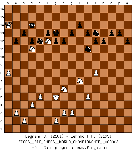 Last move : 1-0 2014 January 17 17:13:28 [Event "FICGS__BIG_CHESS__WORLD_CHAMPIONSHIP__000002"] [Site "FICGS"] [Date "2012.11.18"] [Round "1"] [White "Legrand,Stephane"] [Black "Lehnhoff,Heinz-Georg"] [Result "1-0"] [WhiteElo "2101"] [BlackElo "2195"] 1.m2-m4 j15-k13 2.p1-o3 e15-e13 3.j2-k4 m15-m13 4.b1-c3 d15-d13 5.e2-e4 h15-g13 6.f1-b5 h16-o10 7.h2-g4 g16-j15 8.l1-p5 k16-h15 9.d2-d3 p16-q14 10.n2-n3 n15-n13 11.h1-m5 c15-c14 12.c1-k8 b16-a14 13.m5-n5 o15-o14 14.k8-e13 l16-p12 15.k1-h2 c16-l8 16.e13-l7 o10-b10 17.o1-f9 f16-b12 18.g1-j2 o16-f8 19.m4-m5 m13-m12 20.m1-m4 m16-m14 21.q1-m1 m14-l14 22.m5-m6 q14-o13 23.k4-m5 q15-q13 24.m5-k6 l8-n10 25.e1-e3 o13-n11 26.k6-h7 f8-d10 27.h7-k8 d10-c9 28.e3-f3 f15-f14 29.f3-f5 a14-c13 30.m4-m5 a15-a13 31.m5-l5 c13-e12 32.l7-h4 l14-l5 33.n5-l5 l15-l14 34.p5-m8 k13-l11 35.m8-k6 j15-k13 36.m1-m4 j16-j15 37.a1-e1 e12-d10 38.f9-m3 b10-b8 39.h4-c9 b8-c9 40.j2-h4 e16-e12 41.k8-j6 a16-e16 42.e1-e3 d10-e8 43.b5-a4 n11-m9 44.m6-m7 e16-e15 45.a4-b3 h15-j13 46.e3-f3 q16-e16 47.m3-p6 e12-e9 48.m7-m8 e15-e12 49.l5-m6 e16-e15 50.p6-o5 m9-k10 51.k6-j5 e9-e10 52.o5-m3 e10-b10 53.j5-b12 b10-b12 54.m6-h10 e12-k12 55.f5-b5 c9-g9 56.h10-d14 g9-e9 57.b5-b12 e9-b12 58.d14-b16 l11-m13 59.m4-m5 b12-c13 60.b16-o16 k10-m11 61.f3-f5 c13-j7 62.g4-e3 j7-p7 63.m5-m4 p7-p2 64.b3-h9 n10-k7 65.m3-n4 k7-h9 66.n4-h9 p12-k7 67.h9-k7 k12-k7 68.o3-m2 p2-o2 69.f5-e5 e15-e12 70.o16-a16 k7-b7 71.e5-b5 b7-b5 72.c3-b5 o2-n3 73.h2-k3 e12-e15 74.a16-a13 n3-p1 75.m2-k1 p1-q2 76.a13-a11 e15-e12 77.a11-m11 p15-p13 78.j6-k4 q2-f12 79.m11-f5 f12-b8 80.f2-f4 e8-g7 81.f5-g5 g7-e6 82.g5-e5 b8-b6 83.d3-d4 e6-f4 84.e5-f4 b6-b5 85.b2-b3 b5-b4 86.e4-e5 j13-h11 87.a2-a4 e12-f12 88.h4-f5 q13-q12 89.j1-j2 f12-f10 90.m4-m6 g13-e12 91.f4-g5 h11-g13 92.g5-a11 b4-h10 93.m6-a6 h10-b16 94.a11-e15 j15-h15 95.a6-b6 e12-d14 96.e15-e9 g13-e12 97.b6-g6 d14-f15 98.e9-b9 b16-c15 99.g6-b6 f15-d14 100.b6-a6 c15-b16 101.a6-a9 d14-b13 102.b9-a8 b13-c15 103.k4-h5 c15-a14 104.a8-l8 b16-c15 105.h5-f6 f14-f13 106.f6-e8 f10-f12 107.e8-g9 f12-g12 108.g9-h11 g15-g14 109.a9-h9 h15-g15 110.l8-h8 g12-h12 111.h11-k10 h12-h9 112.k10-h9 c14-c13 113.h9-k10 d13-d12 114.k10-j12 k15-k14 115.h8-j8 g15-f14 116.k1-m2 h14-h13 117.j12-k10 c15-h10 118.k10-m11 h10-j11 119.j8-l10 j11-l11 120.l10-j8 l11-j11 121.j8-k9 j14-j13 122.m11-l9 a14-c15 123.k9-q15 j11-n15 124.q15-p16 b15-b13 125.k3-j5 b13-b12 126.m2-k3 c15-e14 127.l2-l4 n15-m15 128.j5-k7 k13-h12 129.a4-a5 e14-g13 130.k3-j5 g13-j12 131.k7-j9 j12-l11 132.j5-k7 l14-l13 133.p16-d16 f14-e14 134.d16-b14 e14-d13 135.l9-k11 h12-k11 136.j9-k11 m15-g10 137.k11-j9 g10-g11 138.b14-b15 d13-e14 139.b15-a14 e14-d13 140.a5-a6 h13-h12 141.a6-a7 g14-g13 142.a14-f9 d13-e13 143.j9-g10 g11-f10 144.f9-g8 g13-g12 145.a7-a8 e12-g11 146.g10-h8 f10-e10 147.g8-g4 e10-c8 148.g4-e4 g11-e10 149.f5-d6 c8-c10 150.e3-c4 n13-n12 151.d6-f7 o14-o13 152.l4-l5 e10-g11 153.e4-d5 c10-l10 154.c4-e3 l10-o7 155.j2-h2 o7-o6 156.e3-g4 o6-k2 157.h2-g3 k2-j1 158.g3-h4 j1-m4 159.h4-g5 m4-o6 160.f7-e9 o6-o12 161.g4-h6 o12-k16 162.e9-d11 e13-d13 163.h8-g10 g11-e12 164.d5-f7 k16-g13 165.f7-b11 d13-d14 166.g10-f12 d14-c14 167.b11-a12 c14-d14 168.a12-a14 1-0 Follow this game move after move (download)Personally, I rather look forward to a computer program winning the world Chess Championship. Humanity needs a lesson in humility. (Richard Dawkings) Unter Putin wird alles Geld aus Russland wie von einem Staubsauger nach Moskau umgeleitet, das ist wie ein schwarzes Loch. (Garry Kasparov) Cuando tengas duda... ¡juega al Ajedrez!. (Tevis) Lorsque vous vous retrouvez devant une position atroce, ne tendez pas un ultime piège dérisoire avec l'intention d'abandonner si l'adversaire le déjoue ! Faites-vous plutôt un devoir de résister comme si votre vie en dépendait. Jouez le coup qui vous déplairait au centuple si vous étiez dans la peau de votre tortionnaire ! Go and wake up your luck. (Persian saying)