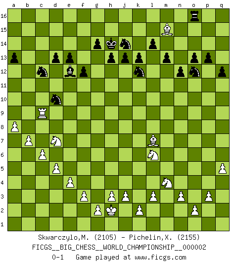 Last move : 0-1 2013 May 21 9:33:3 [Event "FICGS__BIG_CHESS__WORLD_CHAMPIONSHIP__000002"] [Site "FICGS"] [Date "2012.11.18"] [Round "1"] [White "Skwarczylo,Marek"] [Black "Pichelin,Xavier"] [Result "0-1"] [WhiteElo "2105"] [BlackElo "2155"] 1.j2-k4 g15-g14 2.h1-o7 m15-m13 3.o7-c7 j15-k13 4.c7-c15 d15-d14 5.c15-c10 h15-g13 6.p1-o3 c16-f13 7.c10-p10 b16-d15 8.b1-c3 p16-o14 9.h2-g4 e16-c16 10.e2-e4 m16-m14 11.m2-m4 p15-p14 12.f1-b5 g16-j15 13.d2-d3 o16-p15 14.l1-o4 l16-o13 15.n2-n3 o14-n12 16.k1-h2 c16-c10 17.p10-p6 n15-n14 18.c1-d2 q16-m16 19.o1-f9 k13-h12 20.p6-b6 j14-j13 21.b6-b15 d15-b14 22.e1-e3 p15-q14 23.e3-e2 q14-d2 24.e2-d2 h16-d12 25.b15-m5 m14-k14 26.g1-j2 e15-e14 27.m5-l5 d12-l5 28.m4-l5 a16-c16 29.m1-m6 k14-k10 30.m6-a6 c10-a10 31.a6-a10 k10-a10 32.h2-f3 a10-b10 33.j1-h2 m16-m14 34.d2-d1 m14-k14 35.d1-m1 k16-l14 36.m1-m8 d14-d13 37.a2-a4 f16-c13 38.l5-l6 b14-c12 39.q1-m1 c13-b14 40.m1-m5 n12-m14 41.m5-c5 b10-c10 42.c5-c10 f13-c10 43.a1-m1 c10-e12 44.f3-h4 c12-e11 45.f9-a14 c16-c11 46.m8-q8 q15-q13 47.m1-m8 k14-k10 48.m8-c8 k10-c10 49.c8-c10 c11-c10 50.o3-m4 e11-c12 51.a14-b13 l14-k12 52.b13-a12 c10-c11 53.h4-j6 j15-k13 54.j2-h4 l15-l14 55.g4-j5 j16-h15 56.j5-k7 h12-j10 57.l2-l3 k13-h12 58.a12-d9 k15-k13 59.f2-f3 f15-f13 60.d3-d4 e14-e13 61.d4-d5 f13-f12 62.b5-c6 c11-c9 63.d9-g6 o13-p12 64.b2-b4 e12-f11 65.a4-a5 j10-g11 66.b4-b5 g11-h9 67.q8-q9 c9-c11 68.g6-j8 h9-j7 69.j8-f11 g13-f11 70.c3-a4 j7-l6 71.k4-l6 p12-k7 72.c2-c4 f11-g13 73.a5-a6 k7-e12 74.b5-b6 h14-h13 75.a6-a7 h15-h14 76.c4-c5 c11-o11 77.c6-d7 g13-f11 78.c5-c6 f11-d10 79.q9-p9 m14-n12 80.b6-b7 p14-p13 81.a7-a8 q13-q12 82.p2-p3 b14-d12 83.a4-b6 e12-f11 84.j6-k8 o15-o13 85.d7-g4 o11-h11 86.b6-d7 h11-h4 87.g4-q13 h4-h11 88.q13-o15 n14-n13 89.p9-n9 d12-h8 90.o15-n14 n12-p11 91.k8-j6 h8-m12 92.q2-q4 f11-e12 93.n9-a9 a15-a13 94.a9-c9 m12-n11 95.j6-k8 h11-b11 96.q4-q5 b11-b16 97.o4-l7 b16-o16 98.k8-m9 n11-o12 99.m9-o10 n13-n12 100.o10-q11 p11-n10 101.q11-o12 n10-o12 102.n14-m15 h12-j14 0-1 Follow this game move after move (download)All my games are real. (Bobby Fischer) Ich war schon mal beim Dopingtest. Da musste ich Urin abgeben, während Dritte zusahen. (Elisabeth Pähtz) Fischer sacrificó virtualmente todo lo que la mayoría de nosotros los 'debiles' (término que él usa) valoramos, respetamos y apreciamos por el amor de un astuto, a menudo hermoso tablero de juego, por el privilegio ambivalente de ser su mas grande maestro. (Paul Kollar) Les échecs, c'est l'imagination. (David Bronstein) Optimism is a variety of information deficit. Sometimes especially true for correspondence chess games. (Michael Aigner)
