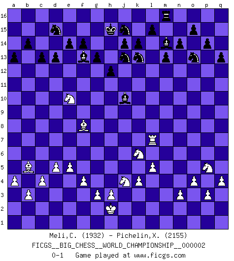 Last move : 0-1 2013 April 1 17:48:3 [Event "FICGS__BIG_CHESS__WORLD_CHAMPIONSHIP__000002"] [Site "FICGS"] [Date "2012.11.18"] [Round "1"] [White "Meli,Cosimo Leonardo"] [Black "Pichelin,Xavier"] [Result "0-1"] [WhiteElo "1932"] [BlackElo "2155"] 1.j2-k4 g15-g14 2.h2-g4 j15-k13 3.m2-m4 m15-m13 4.e2-e4 l16-o13 5.k1-h2 p15-p14 6.d2-d4 h16-d12 7.g1-f3 d15-d13 8.l1-o4 c15-c14 9.n2-n3 o16-p15 10.c2-c3 c16-k9 11.b1-d2 b16-d15 12.p1-o3 e15-e14 13.q2-q4 h14-h13 14.o1-j6 d12-j12 15.h1-m5 f16-b12 16.m1-m3 b12-k4 17.j3-k4 j12-j6 18.h2-j4 k9-n6 19.m5-m6 j6-l4 20.m3-k3 o13-k9 21.f3-h2 l4-l2 22.m4-m5 n6-q9 23.o4-p3 m16-m14 24.d2-f3 m14-l14 25.k3-l3 l2-n4 26.c1-h6 n15-n14 27.q1-l1 n4-m5 28.m6-m5 q9-m5 29.f1-b5 g16-j15 30.j4-k6 m5-p8 31.h2-j4 p8-m11 32.e4-e5 p16-n15 33.j1-h2 n15-o13 34.a2-a4 b15-b14 35.p3-k8 q16-m16 36.l3-l14 k16-l14 37.l1-l7 l14-m12 38.l7-c7 c14-c13 39.e1-l1 h15-f14 40.l1-l5 j16-h15 41.a1-m1 m16-m14 42.h6-e9 k15-k14 43.g4-h6 m14-l14 44.m1-m5 e16-m16 45.h6-g8 f14-g12 46.c7-f7 f15-f14 47.f7-f11 m11-l12 48.g8-j7 k9-j10 49.f11-a11 g12-e13 50.f3-g5 j10-f13 51.o3-p5 l12-j10 52.g5-h7 m16-m14 53.k8-h10 l14-l5 54.m5-l5 m14-l14 55.h7-f8 f13-e12 56.p2-p3 e13-f11 57.h10-g11 f11-e9 58.g11-e9 a15-a13 59.f8-e10 e12-c10 60.e10-d8 c10-f13 61.d8-e10 h13-h12 62.c3-c4 g14-g13 63.b2-b3 m12-k11 64.f2-f4 k11-j13 65.d4-d5 a16-m16 66.e9-f8 p15-q14 67.g2-g3 l14-l5 68.k4-l5 q14-j7 69.a11-a7 j7-l9 70.a7-l7 l9-o12 71.k2-k4 q15-q13 72.o2-o4 o12-m14 0-1 Follow this game move after move (download)Even the laziest King flees wildly in the face of a double check ! (Aaron Nimzowitsch) Du musst nicht gut spielen, es reicht, wenn du besser spielst als dein Gegner. (Anonymous) Todos los Maestros de Ajedrez fueron un día unos principiantes. (Chernev) Je ne suis pas le dernier à jouer lâchement des coups douteux pendant le zeïtnot de l'adversaire pour l'achever: en effet les coups qui font le plus peur sont ceux que l'on ne comprend pas. Je me fais souvent peur quand je joue. (Un professeur anonyme) Your best chance to get a Royal Flush in a casino is in the bathroom. (Anonymous)