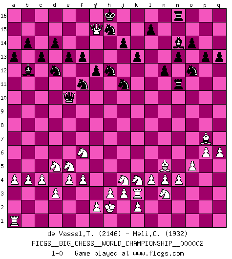 Last move : 1-0 2013 April 25 20:35:21 [Event "FICGS__BIG_CHESS__WORLD_CHAMPIONSHIP__000002"] [Site "FICGS"] [Date "2012.11.18"] [Round "1"] [White "de Vassal,Thibault"] [Black "Meli,Cosimo Leonardo"] [Result "1-0"] [WhiteElo "2146"] [BlackElo "1932"] 1.j2-k4 m15-m13 2.h2-g4 j15-k13 3.m2-m4 h15-g13 4.e2-e4 e15-e13 5.a2-a4 p16-o14 6.f1-b5 h16-o10 7.b1-c3 b16-c14 8.c3-d5 f16-b12 9.g1-j2 g16-j15 10.q2-q4 k16-h15 11.l1-p5 n15-n13 12.o2-o4 d15-d14 13.p1-o3 c16-h11 14.h1-f1 h11-b5 15.f1-b5 m16-m14 16.o3-n5 m14-l14 17.n2-n4 l16-p12 18.k1-h2 e16-e14 19.d2-d3 o16-j11 20.p5-j11 k13-j11 21.o4-o5 e14-f14 22.o1-l4 j15-k13 23.l4-m5 a15-a13 24.c1-g5 a16-b16 25.g5-h4 o10-c10 26.c2-c4 l14-l9 27.b2-b4 f14-f9 28.p2-p4 q15-q13 29.p4-p5 c14-d12 30.q4-q5 b15-b14 31.q5-q6 m13-m12 32.p5-p6 o14-m13 33.m1-m3 m13-o12 34.q1-q3 p15-p13 35.m3-l3 q16-m16 36.b5-b7 j16-j15 37.l3-l9 f9-l9 38.b7-n7 l9-l13 39.f2-f4 o15-o14 40.g4-e5 c10-e10 41.l2-l4 f15-f13 42.e1-e3 g13-f11 43.e3-g3 g15-g13 44.h2-j4 m16-m14 45.h4-e7 l13-l11 46.j1-h2 m14-l14 47.e7-h4 l14-l12 48.q3-k3 l12-g12 49.n7-f7 p12-n14 50.f7-f5 g12-g3 51.j2-g3 g13-g12 52.g3-h5 k13-h12 53.h4-n9 l11-n11 54.n9-p7 k15-k13 55.h5-f6 e10-f10 56.n5-m3 c15-c13 57.f5-k5 f10-e10 58.k5-k12 b16-n16 59.k12-h14 j15-h16 60.h14-g15 1-0 Follow this game move after move (download)The game of chess is the touchstone of the intellect. (Goethe) Es war undenkbar für die Behörden, dass ein sowjetischer Großmeister auf diese Art und Weise [Fischer-Taimanov 6:0] verliert, ohne dass es eine politischer Erklärung dafür gäbe. (Mark Taimanov) La batalla por la última verdad nunca sera ganada. Y es por eso que el Ajedrez es tan fascinante. (Hans Kmoch) Avec des compensations pour le matériel en plus... (Anonyme) A belief is an idea the mind possesses, an idea that possesses the mind. (Robert Oxden Bolton)