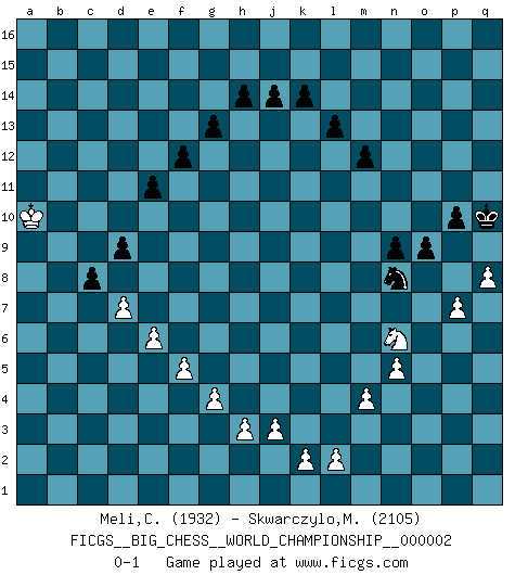 Last move : 0-1 2013 May 9 16:38:33 [Event "FICGS__BIG_CHESS__WORLD_CHAMPIONSHIP__000002"] [Site "FICGS"] [Date "2012.11.18"] [Round "1"] [White "Meli,Cosimo Leonardo"] [Black "Skwarczylo,Marek"] [Result "0-1"] [WhiteElo "1932"] [BlackElo "2105"] 1.j2-k4 p16-o14 2.h2-g4 h15-g13 3.m2-m4 j15-k13 4.p1-o3 m15-m13 5.b1-c3 l16-o13 6.e2-e4 h16-o10 7.f1-b5 g16-j15 8.h1-p8 b16-c14 9.k1-h2 k16-h15 10.g1-j2 e15-e13 11.n2-n4 n15-n14 12.d2-d3 f16-c13 13.o1-f9 d15-d14 14.j2-l3 o13-p14 15.a2-a4 o16-l13 16.l1-p5 c16-k9 17.c1-h6 m16-m14 18.e1-e3 q16-m16 19.q2-q4 e16-e14 20.a1-e1 a16-e16 21.j1-j2 e14-f14 22.e3-f3 o10-k6 23.p8-m8 k6-m8 24.p5-m8 m14-l14 25.l3-m5 l13-g9 26.h6-j5 k9-h7 27.m8-k6 g9-k6 28.j5-k6 c13-k6 29.m5-k6 h7-f9 30.b5-f9 l14-l9 31.f9-h7 f14-f3 32.h2-f3 p14-h7 33.k6-h7 m16-m14 34.q1-q3 l9-p9 35.o3-p5 m14-l14 36.q3-o3 l14-l11 37.f3-d2 e16-e14 38.e1-e3 e14-f14 39.e3-f3 j15-h13 40.f3-f14 h15-f14 41.m1-m3 h13-j11 42.m3-l3 p9-l9 43.l3-l9 l11-l9 44.o3-o6 c14-d12 45.o6-p6 o14-q13 46.p6-l6 l9-l6 47.k4-l6 j11-k9 48.d2-f3 n14-n13 49.c3-d5 o15-o13 50.c2-c4 p15-p13 51.b2-b4 q13-p11 52.o2-o4 q15-q13 53.a4-a5 q13-q12 54.b4-b5 o13-o12 55.a5-a6 p13-p12 56.d3-d4 p11-o9 57.g4-j5 q12-q11 58.f3-g5 q11-q10 59.j5-k7 p12-p11 60.p2-p4 n13-n12 61.p5-n6 k13-l11 62.k7-m8 o9-m8 63.l6-m8 p11-p10 64.m8-k9 l11-k9 65.o4-o5 g13-h11 66.p4-p5 h11-k10 67.g5-j6 k10-l8 68.n4-n5 f14-g12 69.q4-q5 g12-h10 70.o5-o6 j16-j15 71.q5-q6 q10-q9 72.q6-q7 q9-q8 73.j6-l7 k9-l7 74.n6-l7 o12-o11 75.c4-c5 l15-l13 76.b5-b6 m13-m12 77.a6-a7 n12-n11 78.d5-e7 h10-k11 79.e7-g8 k11-l9 80.g8-j9 l8-n9 81.p5-p6 l9-n10 82.l7-n6 n9-m7 83.j9-l8 n10-o8 84.n6-o8 m7-o8 85.l8-n7 o11-o10 86.d4-d5 d12-f11 87.h7-k8 f11-e9 88.k8-m9 o8-m9 89.n7-m9 e9-d7 90.m9-k10 d7-c5 91.f2-f3 c5-b7 92.k10-j12 k15-k14 93.j12-g11 b7-a9 94.a7-a8 a9-b11 95.g11-e12 d14-d13 96.e12-c11 c15-c14 97.c11-e10 d13-d12 98.e10-g11 a15-a13 99.g11-f13 g15-g13 100.f13-d14 f15-f14 101.d14-b15 a13-a12 102.b15-d16 c14-c13 103.d16-c14 a12-a11 104.c14-b16 f14-f13 105.b16-c14 e13-e12 106.c14-e13 b11-d10 107.e13-f15 d10-c12 108.e4-e5 f13-f12 109.f3-f4 e12-e11 110.d5-d6 c12-b10 111.b6-b7 b10-d11 112.b7-b8 a11-a10 113.d6-d7 d11-b10 114.f15-d16 d12-d11 115.d16-c14 b10-a8 116.c14-e13 a8-b10 117.e13-d15 c13-c12 118.d15-e13 d11-d10 119.e5-e6 c12-c11 120.e13-f11 b10-d9 121.f4-f5 d9-b8 122.g2-g4 c11-c10 123.j2-h2 c10-c9 124.h2-g3 b8-d9 125.p6-p7 q8-p7 126.o6-p7 d9-f10 127.q7-q8 f10-h11 128.f11-h10 o10-o9 129.h10-k9 h11-k10 130.k9-m8 k10-m11 131.g3-f4 j15-k15 132.f4-e5 k15-l14 133.m8-l10 l14-m13 134.l10-j11 m11-o10 135.j11-l10 o10-m11 136.e5-d6 m13-n12 137.l10-j11 m11-o10 138.j11-l10 n12-o11 139.l10-m8 o11-p11 140.d6-c7 d10-d9 141.c7-b7 o10-n8 142.m8-n6 p11-q10 143.b7-a8 n11-n10 144.a8-a9 n10-n9 145.a9-a10 c9-c8 0-1 Follow this game move after move (download)Chess is no whit inferior to the violin, and we have a large number of professional violinists. (Mikhail Botvinnik) Wie bekannt hörte Morphy 1859 auf, Schach zu spielen. Seine Enttäuschung galt nicht so sehr dem Schach, wie den Schachspielern. (Robert James Fischer) ¿Porque tengo que perder ante este idiota?. (Aron Nimzovich) La conception d'un plan est le processus par lequel un joueur exploite les avantages de sa position tout en s'efforçant d'en réduire au minimum les inconvénients. Afin de garantir le succès, un plan doit toujours se fonder sur un diagnostic objectif des particularités d'une position. La conception d'un plan est d'autant plus difficile que la position est équilibrée, et grandement facilitée lorsqu'il n'existe qu'un seul plan susceptible de répondre aux exigences de la position. (Harry Golombek) Man is still the most extraordinary computer of all. (John F. Kennedy)
