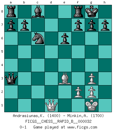 Last move : 0-1 2007 March 20 7:32:47 [Event "FICGS__CHESS__RAPID_B__000032"] [Site "FICGS"] [Date "2007.01.18"] [Round "1"] [White "Andrasiunas,Kestutis"] [Black "Minkin,Alexander"] [Result "0-1"] [WhiteElo "1400"] [BlackElo "1700"] 1.d4 Nf6 2.e4 Nxe4 3.d5 c6 4.c4 Qa5+ 5.Nd2 cxd5 6.b3 dxc4 7.Bxc4 Ng3 8.hxg3 Qe5+ 9.Ne2 Qxa1 10.a4 e6 11.O-O Nc6 12.Ne4 d5 13.Qc2 dxc4 14.Bd2 Qa3 15.Rb1 cxb3 16.Rxb3 Qxa4 17.N4c3 Qc4 18.Be3 Be7 19.Ra3 Bxa3 20.Qd1 O-O 21.Nd4 Qxc3 22.Nb5 Qa5 23.Nxa3 Qxa3 0-1 This chess game has been lost on time (started : 2007.01.18 17:34:17) Queen's pawn game Kingside Castling by player White (move 11) Kingside Castling by player Black (move 20) Player Black won this chess game. Follow this game move after move (download)A good sacrifice is one that is not necessarily sound but leaves your opponent dazed and confused. (Rudolph Spielmann) Wir irren allesamt, nur jeder irrt anders. (Georg Christoph Lichtenberg) Prefiero perder una partida realmente buena, que ganar una mala. (David Levy) Pour se monter efficace, un Cavalier a besoin d'avant-postes ! Les Cavaliers font les meilleurs bloqueurs de pions passés. True nature is revealed in times of difficulty. (Chinese proverb)
