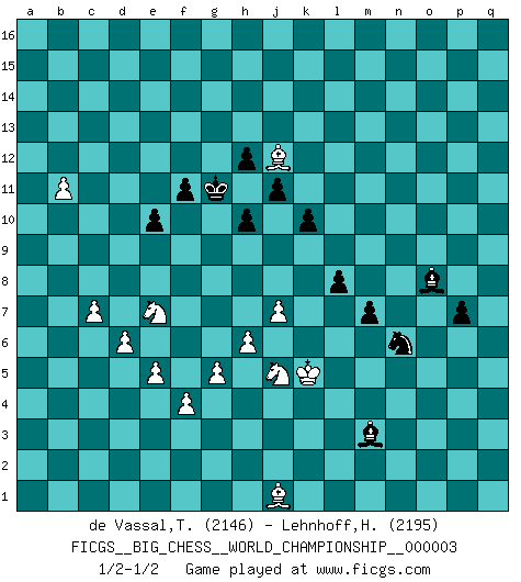 Last move : 1/2-1/2 2014 June 1 14:12:10 [Event "FICGS__BIG_CHESS__WORLD_CHAMPIONSHIP__000003"] [Site "FICGS"] [Date "2012.11.18"] [Round "1"] [White "de Vassal,Thibault"] [Black "Lehnhoff,Heinz-Georg"] [Result "1/2-1/2"] [WhiteElo "2146"] [BlackElo "2195"] 1.j2-k4 g15-g14 2.h2-g4 m15-m13 3.e2-e4 j15-k13 4.m2-m4 e15-e13 5.a2-a4 n15-n13 6.q2-q4 d15-d13 7.l1-p5 h15-g13 8.f1-b5 h16-o10 9.h1-p8 g16-j15 10.o2-o4 o15-o14 11.p1-o3 q15-q13 12.c2-c4 l16-p12 13.k1-h2 b16-a14 14.n2-n4 k16-h15 15.o3-n5 c16-l8 16.b1-c3 f16-b12 17.g1-j2 o16-f8 18.o1-k5 o10-j10 19.k5-l6 e13-e12 20.c3-d5 p16-n15 21.e4-e5 p15-p13 22.d2-d4 m13-m12 23.c1-f4 n15-m13 24.p2-p4 m13-o12 25.g4-f6 p12-o13 26.h2-j4 g13-f11 27.k4-m5 e16-e13 28.j2-h4 m16-m14 29.m1-m3 o13-m11 30.p8-p11 f8-j5 31.m5-k6 q13-q12 32.p11-l7 m14-l14 33.l6-f11 e13-f13 34.f11-g10 f13-f7 35.l7-n9 l8-k7 36.g10-k7 f7-k7 37.l2-l4 m11-p14 38.l4-l5 k7-k9 39.n9-n6 j10-e10 40.n6-l4 e10-f11 41.k6-m5 c15-c13 42.q1-q3 h15-j13 43.m3-k3 k9-k3 44.l4-k3 l14-k14 45.k3-l4 c13-c12 46.q3-k3 q16-m16 47.l4-f9 f11-f9 48.b5-f9 a14-c13 49.b2-b4 c13-d11 50.f6-g8 m16-m14 51.e1-e3 j16-h15 52.p5-l9 f15-f13 53.l9-h6 k13-l11 54.k3-k14 m14-k14 55.h6-b12 j5-b12 56.f4-h6 b12-c13 57.a4-a5 b15-b13 58.d5-f6 a15-a13 59.h6-j7 c13-e15 60.q4-q5 l11-k9 61.j7-k6 e15-l9 62.j4-h6 b13-b12 63.e3-g3 j13-g12 64.h4-f5 k9-m8 65.o4-o5 m8-k7 66.g3-g7 k7-h6 67.f5-h6 l9-j11 68.c4-c5 l15-l13 69.b4-b5 j15-h13 70.a5-a6 h13-g11 71.f9-c6 g11-h9 72.g7-k7 k14-k7 73.h6-k7 k15-k13 74.c6-e4 p14-q13 75.k7-h8 j11-g13 76.a1-a3 a13-a12 77.b5-b6 a12-a11 78.a6-a7 a11-a10 79.a7-a8 a10-a9 80.b6-b7 a16-a10 81.f2-f4 b12-b11 82.a3-a6 g13-j11 83.a6-c6 a10-d10 84.d4-d5 b11-b10 85.c6-c7 j11-h12 86.c7-l7 l13-l12 87.j1-j2 c12-c11 88.l7-p7 h12-f14 89.h8-f9 d10-c10 90.c5-c6 d13-d12 91.p4-p5 j14-j13 92.q5-q6 h14-h13 93.n5-o7 h15-j14 94.o7-m6 k13-k12 95.m5-l7 j14-k13 96.l7-k5 e12-e11 97.e4-f5 c10-q10 98.q6-q7 j13-j12 99.p5-p6 h9-f10 100.g8-f10 d11-f10 101.p7-d7 f10-e12 102.d7-d8 m12-m11 103.n4-n5 n13-n12 104.q7-q8 l12-l11 105.p6-p7 q10-q9 106.f9-h8 e12-d10 107.f6-e8 d10-e8 108.d8-e8 q13-o15 109.f5-e6 o15-q13 110.g2-g4 g12-f10 111.e8-f8 g14-g13 112.h8-j10 f13-f12 113.f8-k8 o12-m13 114.j10-g11 m13-k14 115.g11-j10 k14-m13 116.j10-h12 g13-h12 117.e6-m13 o14-o13 118.k8-p8 q13-p12 119.p8-o8 q9-q11 120.m13-n14 q11-o11 121.o8-o11 p12-o11 122.n14-o13 f10-g8 123.k6-g9 j12-j11 124.k5-j7 g8-j9 125.o13-m15 k13-j13 126.m15-f9 h12-h11 127.j7-g6 f12-f11 128.j2-k3 j13-h12 129.k3-k4 h12-g11 130.k4-j5 n12-n11 131.c6-c7 e11-e10 132.f9-k5 d12-d11 133.g9-e11 f14-g15 134.e11-j15 n11-n10 135.j15-k14 h13-h12 136.k14-m16 p13-p12 137.m16-q12 m11-m10 138.q12-l7 h11-h10 139.l7-o10 k12-k11 140.k5-j6 m10-m9 141.o5-o6 l11-l10 142.p7-p8 c11-c10 143.q8-q9 b10-b9 144.m6-o7 o11-m13 145.o10-j15 k11-k10 146.g6-e7 n10-n9 147.q9-q10 n9-n8 148.o7-q8 g15-c11 149.j5-h5 m13-f7 150.h5-g5 c11-b10 151.d5-d6 f7-d5 152.a8-b9 c10-b9 153.b7-b8 a9-a8 154.j15-d10 d5-g2 155.g5-h4 a8-a7 156.h4-g3 g2-h1 157.p8-p9 b10-h16 158.d10-k16 h16-p9 159.q8-o9 a7-a6 160.k16-o12 p9-o8 161.o9-n11 a6-a5 162.e7-f5 o8-m10 163.o12-q14 p12-p11 164.q10-q11 p11-p10 165.n11-o13 m10-n9 166.h3-h4 h1-d5 167.f5-d4 d5-n14 168.o13-m12 n14-q11 169.g4-g5 n9-q6 170.q14-h6 q11-m15 171.j6-g4 j9-g8 172.h6-l3 m15-j12 173.g4-b9 g8-j7 174.j3-j4 q6-l11 175.m12-n10 l11-n9 176.b9-d11 j7-g6 177.j4-j5 g6-j7 178.k2-k4 n9-q6 179.d11-c10 q6-l1 180.l3-j1 l1-j3 181.d4-f3 j12-c6 182.n10-m8 l10-l9 183.m8-n6 c6-d5 184.c10-e8 d5-b3 185.f3-d2 b3-d1 186.d2-b1 j3-k4 187.b1-c3 d1-l8 188.n6-l7 k4-g1 189.j5-j6 n8-n7 190.h4-h5 m9-m8 191.l7-j8 n7-o6 192.n5-o6 g1-k4 193.j8-h6 p10-p9 194.h6-g4 l8-n6 195.h5-h6 j7-k5 196.g4-e3 k5-l3 197.e3-c4 l3-n4 198.c4-a5 n4-o6 199.m4-m5 o6-m5 200.c3-e4 m5-l3 201.e4-f2 l3-j2 202.g3-h3 k4-l5 203.h3-j4 m8-m7 204.f2-g4 p9-p8 205.a5-c6 l5-o8 206.b8-b9 p8-p7 207.c6-e7 j2-l1 208.g4-j5 l9-l8 209.b9-b10 l1-m3 210.e8-j12 n6-o5 211.j6-j7 m3-l5 212.j4-k5 l5-n6 213.b10-b11 o5-m3 214.k5-j4 m3-l2 215.j4-k5 l2-m3 216.k5-j4 m3-l2 217.j4-k5 l2-m3 1/2-1/2 Thibault de Vassal Thanks for this amazing game... very difficult for me! Heinz-Georg Lehnhoff Thanks for this interesting game. Difficult for you? I thought it would be difficult for me :) At the end I did not want to risk the nearby tournament win. Thibault de Vassal Yes, you had a good game to follow but the decision is very understandable! Follow this game move after move (download)During a Chess competition a Chessmaster should be a combination of a beast of prey and a monk. (Alexander Alekhine) Offensichtlich kennt Kasparow nichts anderes als Schach, und ich könnte 500 weitere Spieler dieser Sorte benennen. (Judith Polgar) El Ajedrez es una guerra en un tablero. El objetivo es aplastar la mente del oponente. (Bobby Fischer) Les Echecs représentent une sphère d'idées créatrices basée sur la volonté des deux protagonistes. (Smyslov) Hold em is to stud what chess is to checkers. (Johnny Moss)