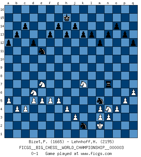 Last move : 0-1 2013 November 12 19:17:40 [Event "FICGS__BIG_CHESS__WORLD_CHAMPIONSHIP__000003"] [Site "FICGS"] [Date "2012.12.26"] [Round "1"] [White "Bizet,Patrick"] [Black "Lehnhoff,Heinz-Georg"] [Result "0-1"] [WhiteElo "1665"] [BlackElo "2195"] 1.j2-h4 m15-m13 2.g2-g4 e15-e13 3.b2-b3 j15-k13 4.c1-b2 o15-o14 5.p1-o3 n15-n13 6.f2-f4 d15-d13 7.e2-e4 p16-q14 8.f1-b5 h16-l13 9.h1-k3 c15-c14 10.c2-c4 b16-a14 11.m2-m4 h15-g13 12.l1-p5 k16-h15 13.m1-m3 g16-j15 14.m3-l3 l13-n11 15.b2-e5 f16-b12 16.l3-l5 l16-p12 17.b1-c3 o16-f8 18.g1-f3 c16-l8 19.e1-e3 e13-e12 20.e3-d3 f8-e9 21.n2-n3 m13-m12 22.o1-f9 l15-l14 23.h2-j4 a14-c13 24.d3-d7 c13-d11 25.a1-e1 a15-a13 26.e1-e3 e16-e14 27.d7-l7 l8-o11 28.k1-l3 e14-g14 29.l3-n2 h15-j13 30.e3-d3 d11-e13 31.d3-d9 e9-f10 32.l5-f5 f10-g11 33.l7-n7 n11-q8 34.p5-o4 g11-o4 35.n2-o4 g13-f11 36.n7-j7 f11-h10 37.f9-c6 e13-f11 38.q1-m1 a16-e16 39.m1-m3 h10-g8 40.j7-h7 q8-q10 41.k3-k8 b12-d14 42.k8-k10 q10-k10 43.e5-k10 o11-n12 44.f5-f7 n12-h7 45.f7-h7 g8-f10 46.d9-b9 b15-b13 47.c6-j12 h14-h13 48.j12-p6 j13-l12 49.k10-p5 q14-o13 50.c3-d5 o13-n11 51.d5-e7 p12-o13 52.h7-f7 f10-d11 53.b5-f9 f11-d10 54.f9-d11 e12-d11 55.b9-d9 d10-c12 56.d9-d11 k13-h14 57.h4-g6 j16-h15 58.f3-e5 d14-e15 59.m3-k3 e15-p5 60.o3-p5 k15-k13 61.p5-n6 e16-e13 62.n6-m8 m16-e16 63.o4-n6 e13-e11 64.f7-f11 e11-d11 65.f11-d11 e16-e13 66.k3-k11 q16-e16 67.e7-c8 e13-e10 68.p6-m3 e10-a10 69.a2-a4 a10-a8 70.c8-d6 g14-g10 71.d11-f11 a8-b8 72.f11-b11 g10-b10 73.b11-b10 b8-b10 74.d6-b5 f15-f13 75.q2-q4 q15-q13 76.p2-p4 p15-p13 77.q4-q5 l14-l13 78.q5-q6 l12-j13 79.k11-f11 g15-g14 80.f11-f7 o13-n12 81.m3-j6 q13-q12 82.o2-o4 a13-a12 83.j4-g5 j15-l14 84.f7-e7 e16-e7 85.g6-e7 h14-g12 86.d2-d4 l14-k12 87.e5-g6 g12-j11 88.g6-h8 k12-l10 89.e7-f9 l10-m8 90.n6-m8 j11-l10 91.m8-l10 n12-l10 92.p4-p5 l10-p6 93.j1-k1 b10-l10 94.j6-m3 p6-m3 95.l2-m3 j13-g12 96.d4-d5 d13-d12 97.g5-j6 n11-m9 98.j6-l5 m9-n7 99.k1-l2 c12-e11 100.f9-e7 g12-h10 101.h3-h4 h10-j8 102.a4-a5 j8-h6 103.g4-g5 h6-g4 104.b3-b4 g4-f2 105.e4-e5 n7-m5 106.l2-m2 f2-h3 107.f4-f5 h3-k2 108.b5-d6 l10-k10 109.h8-k7 k10-n10 110.l5-n4 n10-n7 0-1 Follow this game move after move (download)Every Pawn is a potential Queen. (James Mason) Ein Schachspiel besteht aus drei Phasen: Die erste, wenn du hofftst den Vorteil zu haben, die zweite, wenn du glaubst einen Vorteil zu haben, und die dritte.... wenn du weißt Du wirst verlieren. (Savielly Grigorievitsch Tartakower) La caracteristica mas importante en la posición del Ajedrez es la actividad de las piezas. Esto es absolutamente fundamental en todas las fases del juego: Apertura, Juego Medio y especialmente Finales. La limitación primordial en la actividad de una pieza, es la estructuración de los Peones. (Michael Stean) Les échecs sont plus proches de l'art de l'assassinat que de l'art de la guerre. (Arturo Perez-Reverte) Wawaweewa ! (Borat: Cultural learnings of America for make benefit glorious nation of Kazakhstan)