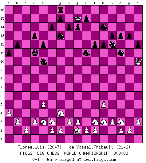 Last move : 0-1 2013 May 27 23:49:56 [Event "FICGS__BIG_CHESS__WORLD_CHAMPIONSHIP__000003"] [Site "FICGS"] [Date "2012.11.18"] [Round "1"] [White "Flores,Luis"] [Black "de Vassal,Thibault"] [Result "0-1"] [WhiteElo "2047"] [BlackElo "2146"] 1.j2-k4 h15-g13 2.e2-e4 j15-k13 3.p1-o3 m15-m13 4.m2-m4 e15-e13 5.l1-p5 k16-h15 6.b1-c3 a15-a13 7.n2-n3 f16-b12 8.f1-b5 g16-j15 9.d2-d3 q15-q13 10.c1-k8 c15-c13 11.o1-d11 e13-e12 12.d11-f9 l16-p12 13.g1-f3 o15-o13 14.k1-l3 p16-o14 15.h2-g4 b16-c14 16.e4-e5 d15-d13 17.e1-e4 c14-d12 18.e4-d4 o14-n12 19.m4-m5 n15-n13 20.h1-l4 o16-l13 21.k8-j9 m13-m12 22.f9-h7 l13-k14 23.a1-e1 h16-f16 24.e1-e4 e16-e14 25.e4-f4 f16-e15 26.m1-m4 e14-f14 27.j1-j2 m16-m14 28.l4-k5 m14-l14 29.m4-l4 l14-l4 30.k5-l4 b15-b13 31.q1-m1 a16-a14 32.l4-l12 k13-m14 33.l12-m13 j15-l14 34.m1-m4 c16-l8 35.p5-o4 e15-d15 36.m13-h9 l8-j10 37.h9-l6 j16-j15 38.j9-e13 f14-f4 39.d4-f4 f15-f14 40.e13-g11 q16-l16 41.m4-l4 l14-j13 42.g11-h10 j13-k11 43.h10-g11 k14-g11 44.o4-g11 l15-l13 45.b5-f9 h15-j13 46.g11-c7 l13-l12 47.l6-k5 a14-e14 48.h7-j6 e14-e13 49.f9-g8 p12-j6 50.k5-j6 j10-g8 51.j6-g8 d15-g12 52.g8-d5 e13-f13 53.f4-f13 g12-f13 54.q2-q3 p15-p13 55.d5-g8 f13-f11 56.c7-d6 f11-b7 57.c3-d1 b7-e10 58.g8-l8 k11-m10 59.l8-l7 j13-k11 60.k4-m3 e10-c10 61.d1-e3 c10-j10 62.b2-b3 l16-e16 63.l7-c15 j15-h15 64.l4-j4 j10-f13 65.c15-g11 f13-f11 66.g11-l15 b12-f8 67.d6-c7 e16-l16 68.l15-d8 a13-a12 69.j4-j8 f11-j8 70.c7-d6 d12-e10 71.d8-c8 j8-f11 72.d6-f8 e10-f8 73.c8-c13 f11-d11 74.c13-f10 f8-e10 75.f10-f13 h15-j15 76.f13-d15 l16-g16 77.d15-n6 a12-a11 78.a2-a4 b13-b12 79.n6-q9 q13-q12 80.q9-q10 m10-o11 0-1 Comment by player 2 : Thibault de Vassal : Thanks for the game... well, I've just been lucky with the rook (I was still able to give it back, such things happen to everyone). Follow this game move after move (download)In life, as in Chess, one's own Pawns block one's way. A man's very wealth, ease, leisure, children, books, which should help him to win, more often checkmate him. (Charles Buxton) Es gibt Leute, die glauben, alles wäre vernünftig, was man mit einem ernsthaften Gesicht tut. (Georg Christoph Lichtenberg) ¿Quién es tu oponente esta tarde? Esta tarde mi oponente son las piezas negras. (Akiba Rubinstein) Tous ces prétendus hommes politiques sont les pions, les Cavaliers, les Tours ou les Fous d'une partie d'échecs qui se jouera tant qu'un hasard ne renversera pas l'échiquier. (Honoré de Balzac) Never risk one's whole fortune unless supported by one's entire army. (Niccolo Machiavelli)