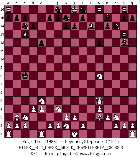 Last move : 0-1 2012 November 24 20:30:59 [Event "FICGS__BIG_CHESS__WORLD_CHAMPIONSHIP__000003"] [Site "FICGS"] [Date "2012.11.18"] [Round "1"] [White "Kuge,Tom"] [Black "Legrand,Stephane"] [Result "0-1"] [WhiteElo "1985"] [BlackElo "2101"] 1.j2-k4 p16-o14 2.e2-e4 j15-k13 3.h2-g4 e15-e13 4.f1-c4 m15-m13 5.p1-o3 h16-o10 6.b1-c3 l16-p12 7.k1-h2 f16-c13 8.m2-m4 d15-d14 9.d2-d4 c16-l8 10.c1-e3 n15-n14 11.l1-p5 b16-c14 12.n2-n3 e13-e12 13.g1-f3 o16-f8 14.k4-l6 o10-c10 15.c4-h9 c10-l2 16.o1-m3 l2-d9 17.h9-g8 e16-e13 18.m1-l1 d9-b9 19.g8-b3 e13-h13 20.f3-e5 m13-m12 21.p5-m8 k13-l11 22.l6-j7 l8-o11 23.h1-m5 f8-g9 24.l1-l9 b9-c8 25.j7-k9 l11-n10 26.l9-l15 n10-m8 27.k9-m8 o11-l14 28.l15-o15 q16-p16 29.e3-p13 h13-p13 30.o15-n15 g9-n15 0-1 Follow this game move after move (download)It's just you and your opponent at the board and you're trying to prove something. (Bobby Fischer) Ich spiele ehrlich und spiele, um zu gewinnen. Wenn ich verliere nehme ich meine Medizin. (Robert James Fischer) Un Peón pasado es un criminal, quién debe ser mantenido bajo candado y llave. Leves medidas, tales como vigilancia policiaca, no son suficientes. (Aaron Nimzovich) Il s'avisa de me proposer d'apprendre les échecs qu'il jouait un peu... me voilà forcené des échecs. J'achète un échiquier, je m'enferme dans ma chambre, j'y passe des jours et des nuits à vouloir apprendre par cur toutes les parties. (Jean-Jacques Rousseau, Confessions) A government big enough to give you everything you want is strong enough to take everything you have. (Thomas Jefferson)