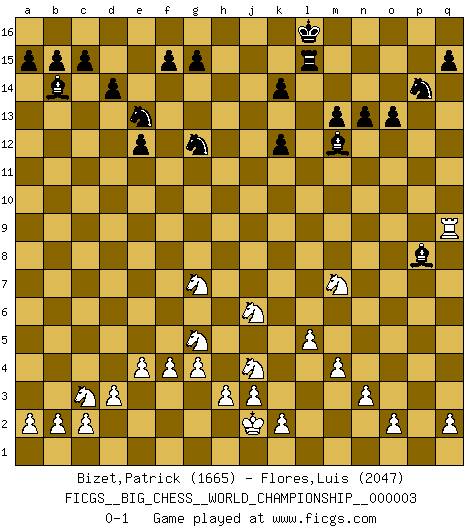 Last move : 0-1 2013 June 5 19:7:49 [Event "FICGS__BIG_CHESS__WORLD_CHAMPIONSHIP__000003"] [Site "FICGS"] [Date "2012.12.26"] [Round "1"] [White "Bizet,Patrick"] [Black "Flores,Luis"] [Result "0-1"] [WhiteElo "1665"] [BlackElo "2047"] 1.j2-h4 h15-g13 2.g2-g4 p16-o14 3.b1-c3 b16-c14 4.f2-f4 g16-f14 5.e2-e4 k16-l14 6.g1-f3 m15-m13 7.p1-o3 e15-e13 8.h2-j4 f16-c13 9.h1-k3 j15-k13 10.f1-b5 l16-p12 11.d2-d3 n15-n14 12.c1-e3 d15-d14 13.e3-a7 c16-l8 14.m2-m4 o16-g9 15.l1-p5 h16-n11 16.j4-g5 e13-e12 17.b5-k13 j14-k13 18.k3-k13 p12-n10 19.k13-k5 j16-k16 20.m1-m3 e16-j16 21.m3-k3 k15-k14 22.k1-h2 j16-j12 23.k5-e10 l8-g12 24.e10-g10 a16-j16 25.n2-n3 g12-f11 26.g10-b10 c13-b14 27.b10-b5 m16-m14 28.k3-l3 j12-l12 29.l3-l12 n10-l12 30.o1-f9 l14-k12 31.o3-n5 f11-p2 32.q1-p1 p2-j8 33.f9-e10 j8-f11 34.e10-f11 n11-f11 35.p5-g13 h14-g13 36.a7-g13 k16-l16 37.p1-p15 m14-m15 38.p15-p6 q16-p16 39.p6-p16 o14-p16 40.j1-j2 p16-n15 41.e1-p1 l15-l14 42.b5-e5 g9-h8 43.e5-e9 h8-f10 44.e9-f8 l14-l13 45.l2-l4 f11-g12 46.g13-m8 n15-p14 47.m8-n9 f10-g9 48.f8-g7 g12-d9 49.p1-p9 g9-h8 50.g7-p7 d9-g12 51.n9-k12 g12-k12 52.p7-k12 l13-k12 53.p9-q9 o15-o13 54.h4-j6 h8-l11 55.f3-h4 j16-j9 56.q9-j9 l11-j9 57.a1-p1 m15-h15 58.p1-p9 j9-m12 59.p9-m9 n14-n13 60.h2-j4 c14-e13 61.h4-f5 f14-g12 62.f5-g7 h15-h10 63.m9-q9 h10-h15 64.n5-m7 h15-l15 65.l4-l5 l12-p8 0-1 Follow this game move after move (download)The mistakes are there, waiting to be made. (Savielly Tartakower) Ein Buch ist ein Spiegel; wenn ein Affe hineinsieht, so kann kein Apostel heraus gucken. (Georg Christoph Lichtenberg) La esencia del Ajedrez es pensar acerca de lo que el Ajedrez es. (David Bronstein) La tactique, c'est ce que vous faites quand il y a quelque chose à faire; la stratégie, c'est ce que vous faites quand il n'y a rien à faire. (Savielli Tartacower) You cannot beat a roulette table unless you steal money from it. (Albert Einstein)