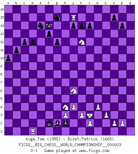 Last move : 0-1 2013 May 21 23:7:6 [Event "FICGS__BIG_CHESS__WORLD_CHAMPIONSHIP__000003"] [Site "FICGS"] [Date "2012.12.26"] [Round "1"] [White "Kuge,Tom"] [Black "Bizet,Patrick"] [Result "0-1"] [WhiteElo "1985"] [BlackElo "1665"] 1.j2-k4 j15-h13 2.m2-m4 g15-g13 3.e2-e4 m15-m13 4.f1-c4 f15-f13 5.d2-d3 h16-f14 6.l1-o4 e15-e13 7.n2-n3 p15-p14 8.h2-g4 o16-p15 9.b1-c3 b15-b14 10.o1-g8 c16-b15 11.p1-o3 l16-o13 12.g8-m13 n15-n14 13.m13-p10 h15-j13 14.c1-k8 h13-f12 15.m1-m3 f16-b12 16.m3-l3 k16-l14 17.h1-l4 c15-c13 18.c4-g8 d15-d13 19.g8-f9 g16-j15 20.g1-f3 b16-c14 21.e4-e5 c14-d12 22.q2-q4 j16-h15 23.q4-q5 p16-n15 24.k1-h2 n15-m13 25.q5-q6 m13-k12 26.e5-e6 d12-e14 27.q6-q7 d13-d12 28.j1-j2 p15-g7 29.f3-h4 f14-g14 30.p10-l6 b15-l6 31.l4-l6 e16-e15 32.h4-j6 g7-d10 33.l3-l5 g14-o7 34.k2-k3 o7-b7 35.k8-j9 q16-n16 36.l5-b5 b7-p7 37.e6-e7 m16-m15 38.e7-e8 d10-e9 39.h2-j4 n14-n13 40.o4-q6 p7-p11 41.j4-h6 e9-h6 42.g4-h6 b12-h6 43.b5-h5 h6-b12 44.e8-e9 p11-f2 45.f9-c6 f2-b6 46.c6-b5 a16-m16 47.j9-g11 j15-g14 48.l6-h9 o13-n14 49.h9-h14 h15-g16 50.h14-h7 m15-m7 51.h7-j8 m7-q7 52.q6-k12 q7-q1 53.e1-q1 l14-k12 54.b5-n16 m16-n16 55.g11-j13 g14-j13 56.j8-j13 b6-b2 57.j13-k12 b2-c3 58.k12-k9 g13-g12 59.k9-l9 e15-f15 60.a1-c1 l15-l14 61.q1-q15 n13-n12 62.q15-q8 n16-h16 63.h5-h16 g16-h16 64.q8-h8 f12-h13 65.l9-j9 c3-d2 66.j9-e13 e14-g15 67.c1-g1 d2-c2 68.e13-d13 f15-e15 69.d13-d16 e15-e16 70.d16-k10 h16-j15 71.k10-m12 k15-k14 72.m12-n12 n14-m13 73.n12-n15 j15-h14 74.n15-n9 h14-g14 75.o3-n5 c2-d3 76.g1-e1 d3-d2 77.n9-g3 e16-e11 78.e1-q1 b12-e9 79.n5-l6 e11-g11 80.g3-g11 e9-g11 81.j6-h4 d2-a2 82.q1-q8 g11-c7 83.q8-q1 g15-e14 84.k4-j6 m13-d5 85.j2-k2 a15-a13 86.k2-l3 a13-a12 87.h8-o8 a12-a11 88.o8-o7 c7-h2 89.j3-j4 b14-b13 90.o7-m7 b13-b12 91.m7-m15 a11-a10 92.l6-k8 c13-c12 93.k8-l10 b12-b11 94.q1-e1 h13-g15 95.l10-k12 g14-f14 96.m15-j15 a2-f2 97.e1-d1 d5-g2 0-1 Follow this game move after move (download)We cannot resist the fascination of sacrifice, since a passion for sacrifices is part of a Chessplayer's nature. (Rudolf Spielman) Wer nie einen Fehler gemacht hat, hat nie etwas Neues ausprobiert. (Albert Einstein) La caracteristica mas importante en la posición del Ajedrez es la actividad de las piezas. Esto es absolutamente fundamental en todas las fases del juego: Apertura, Juego Medio y especialmente Finales. La limitación primordial en la actividad de una pieza, es la estructuración de los Peones. (Michael Stean) Il n'y a pas de prix trop élevé au scalp de l'ennemi. (Koblentz) Art is the triumph over chaos. (John Cheever)