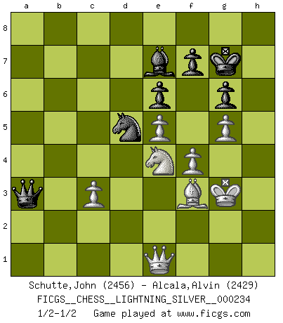 Last move : 1/2-1/2 2012 November 19 20:38:45 [Event "FICGS__CHESS__LIGHTNING_SILVER__000234"] [Site "FICGS"] [Date "2012.11.19"] [Round "1"] [White "Schutte,John"] [Black "Alcala,Alvin"] [Result "1/2-1/2"] [WhiteElo "2456"] [BlackElo "2429"] 1.e4 c5 2.Nf3 d6 3.d4 cxd4 4.Nxd4 Nf6 5.Nc3 a6 6.Be2 Nbd7 7.O-O g6 8.a4 Bg7 9.a5 Nc5 10.f3 O-O 11.Be3 Bd7 12.Bc4 Rc8 13.Ba2 b5 14.axb6 Qxb6 15.Nb3 Bh6 16.f4 Rfd8 17.Qe1 Qb7 18.Bxc5 dxc5 19.Na5 Qb8 20.e5 Nh5 21.g3 c4 22.Bxc4 Qxb2 23.Rf2 Qb6 24.Nd5 Qc5 25.Nb4 Qb6 26.Bxa6 Rb8 27.c3 Bf8 28.Bf1 Ra8 29.Nc4 Qc5 30.Na6 Qc6 31.Ne3 Bh3 32.Bxh3 Rxa6 33.Rxa6 Qxa6 34.Rd2 Rxd2 35.Qxd2 e6 36.Bf1 Qa7 37.Kh1 Ng7 38.Ng4 Nf5 39.Kg2 h5 40.Nf6+ Kg7 41.Be2 Be7 42.Ne4 h4 43.Bf3 hxg3 44.hxg3 Bc5 45.Qe1 Qa3 46.Qb1 Ne3+ 47.Kh3 Qa8 48.g4 Be7 49.Kg3 Qa3 50.Qe1 Nd5 51.g5 1/2-1/2 Sicilian : Najdorf, Opovcensky variation Kingside Castling by player White (move 7) Kingside Castling by player Black (move 10) This chess game ended in a draw. Follow this game move after move (download)The King is a fighting piece. Use it ! (Wilhelm Steinitz) Ein Großmeister muß tausende Partien in seinem Kopf speichern, denn diese sind für Ihn, was die Worte der Muttersprache für gewöhnliche Leute sind, oder Noten für Musiker... (Garry Kasparov) Debes de llevar a tu oponente hacia un profundo y obscuro bosque donde 2+2=5, y el camino que conduce a la salida es suficientemente ancho para solamente uno. (Mikhail Tal) Les Echecs représentent une sphère d'idées créatrices basée sur la volonté des deux protagonistes. (Smyslov) Gambling : The sure way of getting nothing from something. (Wilson Mizner)